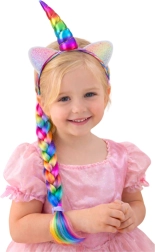 Deze kinderhaarband met een regenboogkleurige eenhoornhoorn en glinsterende oortjes betovert met felle kleuren en een speels design. De lange synthetische haren in levendige tinten zijn aan de haarband bevestigd, zodat je eenvoudig vlechtjes kunt maken, staartjes kunt vormen en fantasiekapsels kunt creëren.