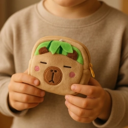 Deze schattige portemonnee van zachte pluche, in capibara-design met een groene meloen bovenop, overtuigt door uiterlijk én functionaliteit. Het zachte materiaal voelt prettig aan, terwijl het compacte formaat het meenemen overal naartoe gemakkelijk maakt. Perfect voor muntjes, sleutels en andere kleinigheden.
