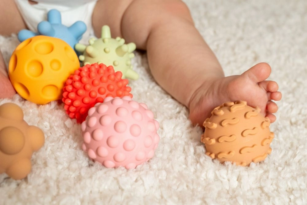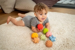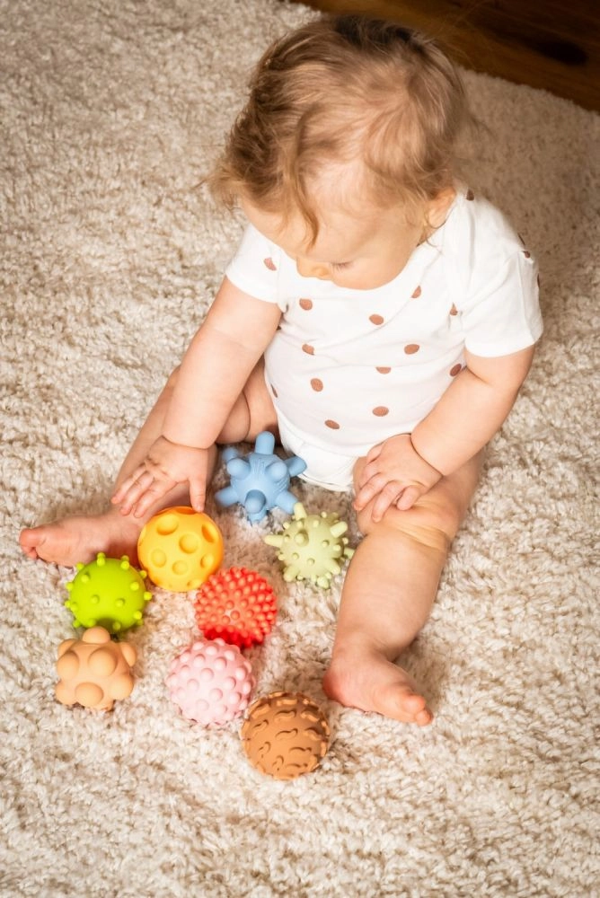 Elke bal heeft een uniek oppervlak met bobbels, noppen of groeven die de tastzin en natuurlijke nieuwsgierigheid van het kind stimuleren.