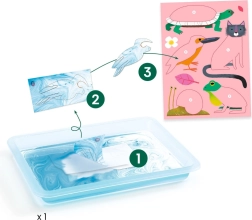 De creatieve marmeringsset van DJECO biedt kinderen een leuke manier om unieke dierenmotieven te maken. Druppel simpelweg gekleurde inkten op het wateroppervlak, creëer patronen en breng deze over op de sjablonen. Het resultaat zijn originele afbeeldingen die eruitzien alsof ze door een kunstenaar zijn gemaakt.