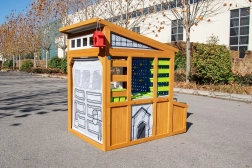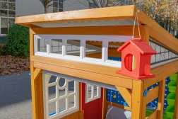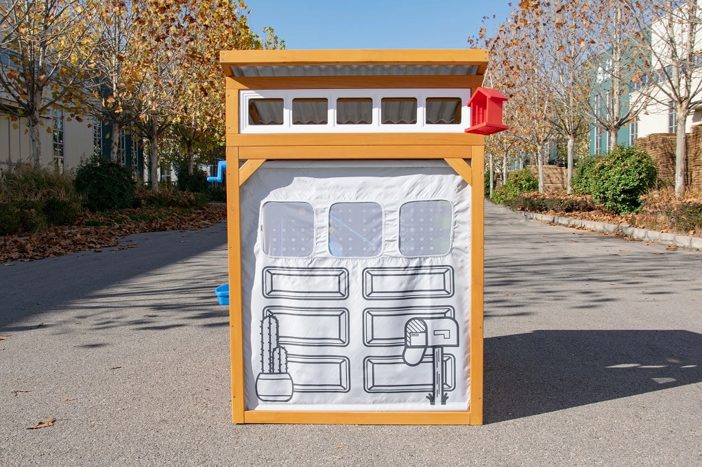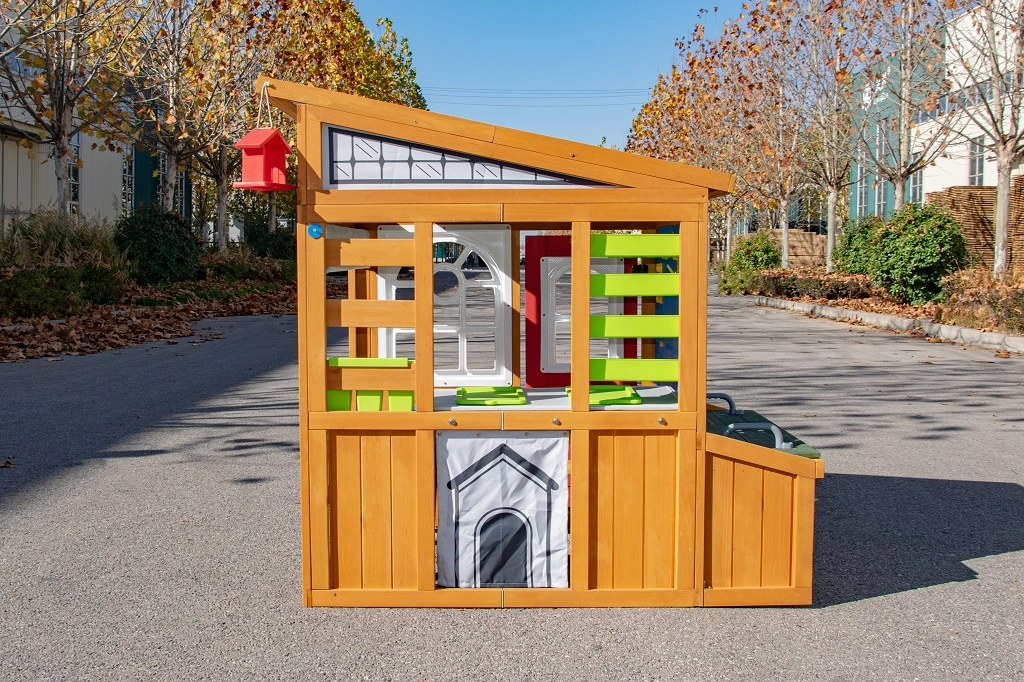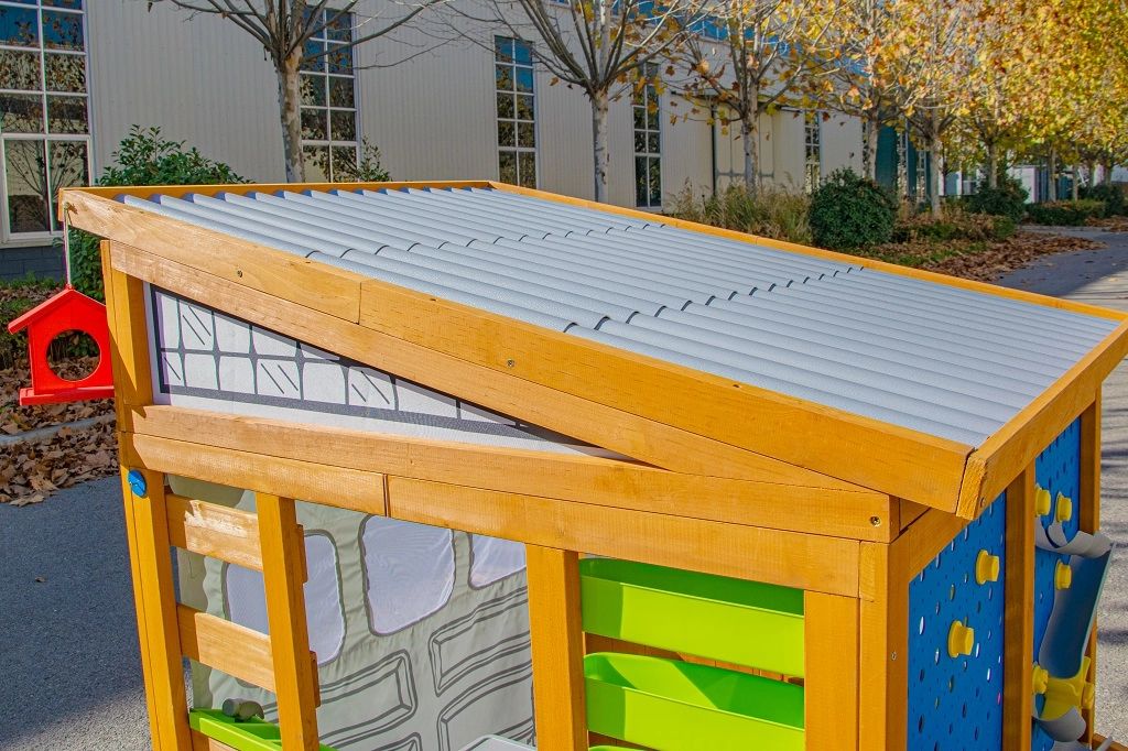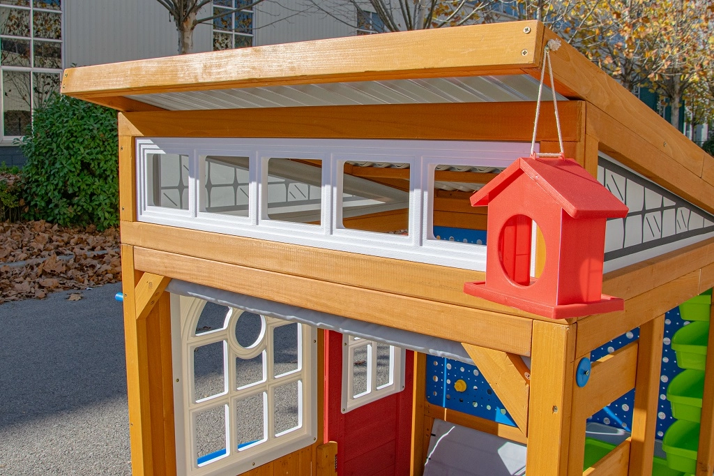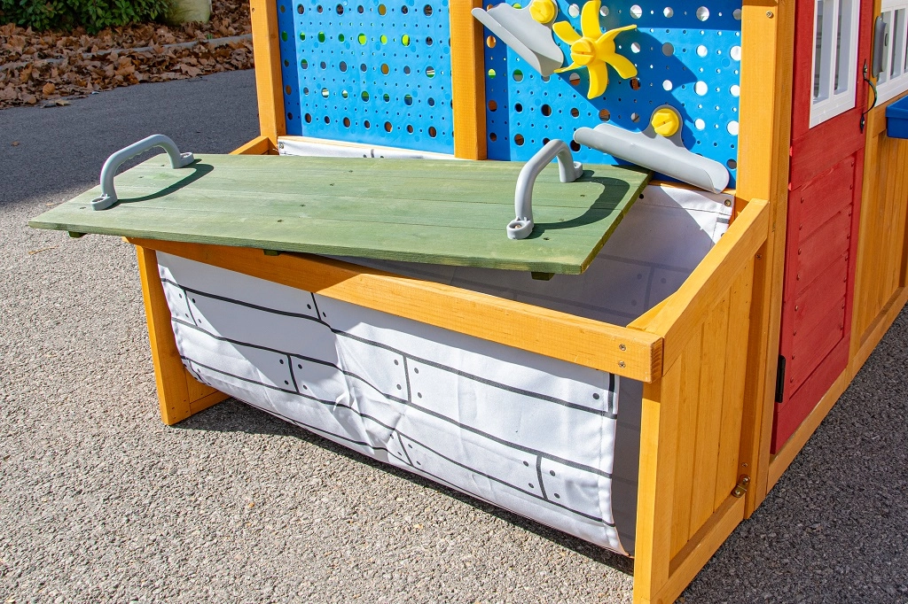 Het rolbare “garage”-rolluik met handgreep, de robuuste bank met een draagvermogen van 100 kg en details zoals het vogelvoederhuisje en de bloembak verbinden het spel met de omringende natuur.