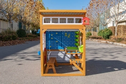 Het Hobby Workshop-tuinhuis verandert je tuin in een veilige en stimulerende speelplek. De robuuste houten constructie met schuin dak doet denken aan een kleine werkplaats en nodigt uit tot fantasierijk spel. Kinderen genieten van het openen en sluiten van het rolbare rolluik met handgreep, experimenteren aan de pegboardwand en werken aan de verhoogde tafel met praktisch werkblad.