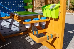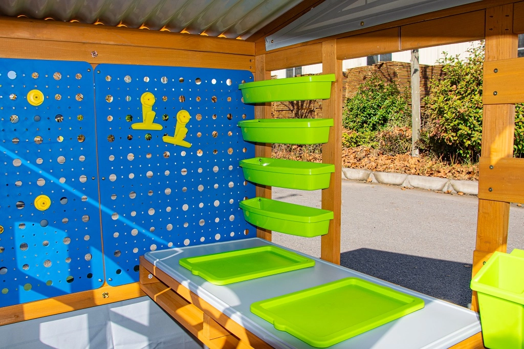 De verhoogde tafel met werkblad, plankjes, bakken en bekers houdt gereedschap en materialen altijd binnen handbereik. Kinderen leren organiseren en zelfstandig werken tijdens het knutselen en experimenteren.