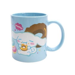Lichtblauwe keramische mok met Cinnamoroll- en donutprint, ideaal voor je ochtendkoffie of avonddrankje. Glanzend glazuur en een comfortabel oor voor prettig vasthouden.