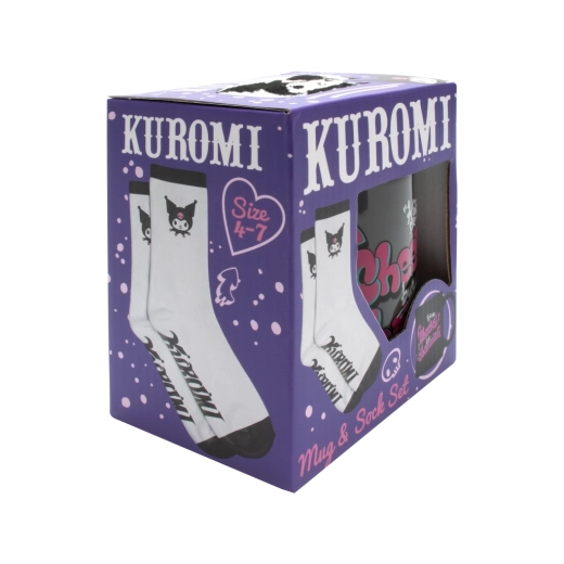 Deze cadeauset combineert praktisch gebruik met een speels design. De keramische mok in donkergrijs is versierd met de iconische KUROMI in een zwart kostuum met roze accenten en de tekst “Cheeky but charming” in graffitistijl. De sokken van een prettig breisel met elastaan zitten mooi aangesloten en matchen met de mok – op de wreef staat een Kuromi-graphic en op de zool de tekst “Kuromi”.