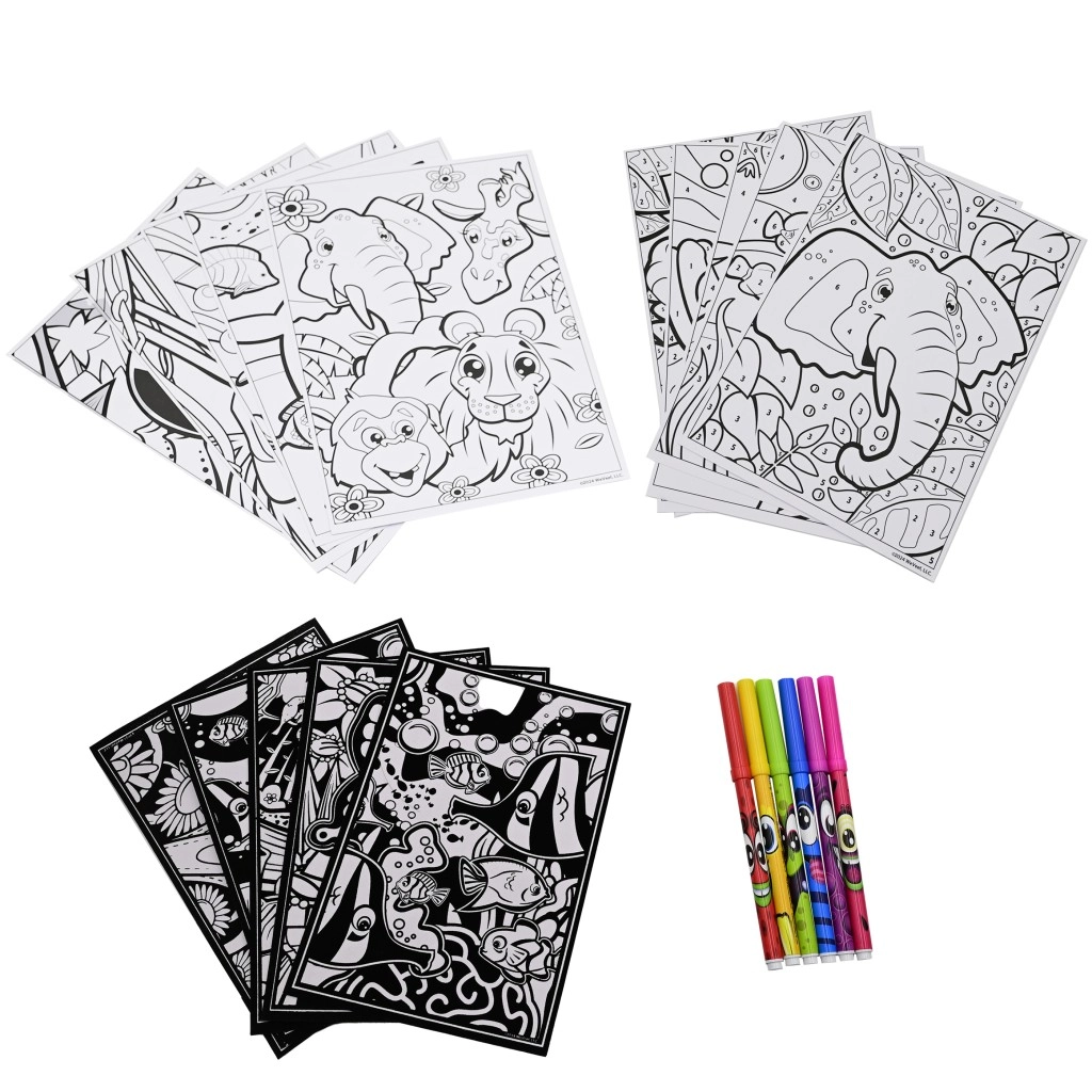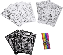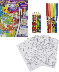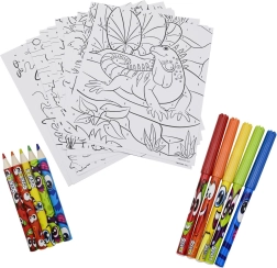 De set bevat kleurplaten met dieren, geurende stiften en kleurpotloden – ideaal voor snel en kleurrijk inkleuren thuis en onderweg.