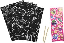 Zwarte kaartjes onthullen na het wegkrassen levendige kleuren. Inclusief houten stylussen en stickers voor extra versiering.