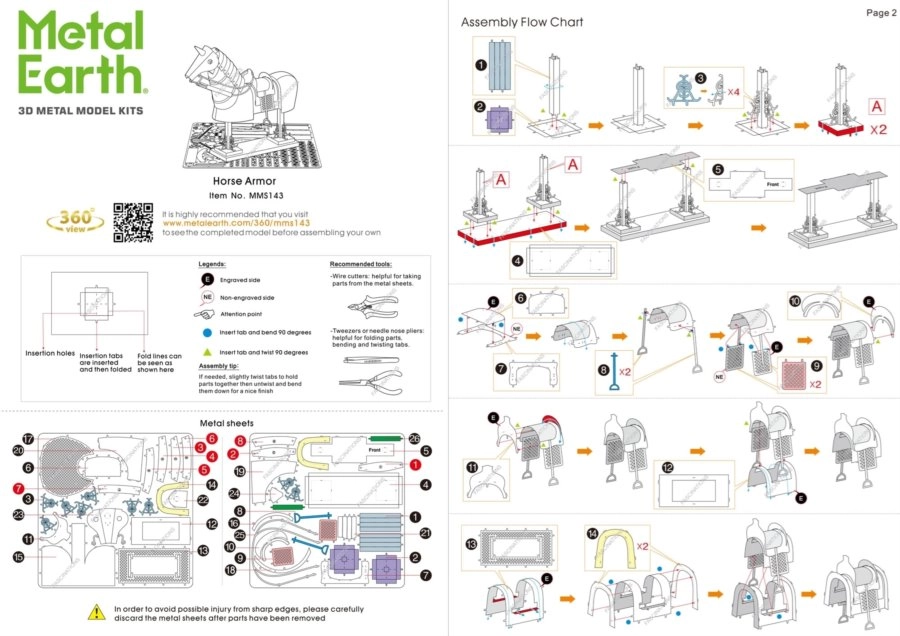 Haal de onderdelen uit de metalen plaatjes (kleine zijkniptangetjes aanbevolen), verbind ze met lipjes en vergrendelingen en buig met een fijn tangetje. Werk stap voor stap alle verbindingen af en creëer een realistisch model van een paardenzwaardrusting.