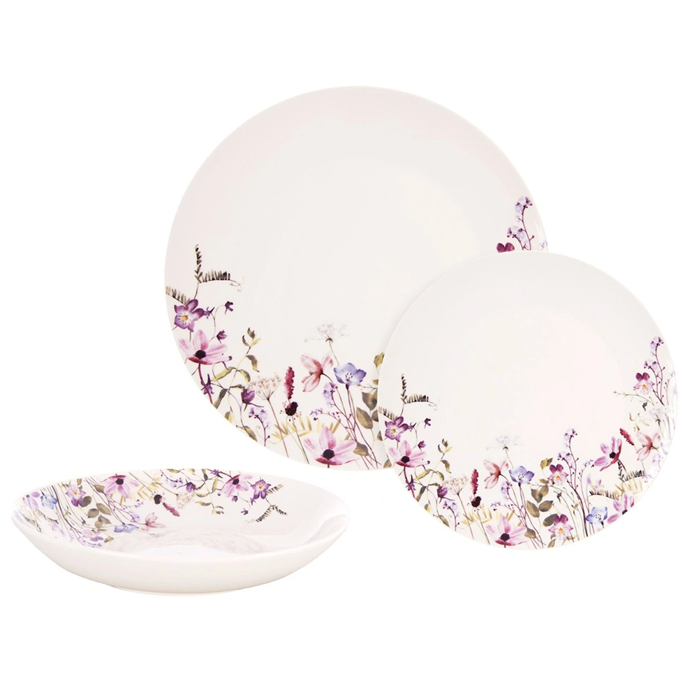 Elegante porseleinen dinerset voor 6 personen met een subtiel bloemendecor verfraait elke tafel. Bevat 18 delen: diepe borden voor soepen en pasta, grote platte borden voor hoofdgerechten en dessertborden. Het wit geglazuurde porselein is geschikt voor vaatwasser en magnetron, ideaal voor dagelijks gebruik en feestelijk dineren.