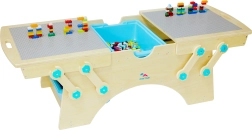 Houten speeltafel voor kinderen vanaf 3 jaar met twee speeloppervlakken en ruime opbergboxen, ideaal voor creatief bouwen. Is compatibel met LEGO-, QMAN-, SLUBAN-, L-W-blokken en meer, heeft een veilig design met afgeronde randen en een duurzame constructie. Inclusief bouwset voor direct speelplezier en een gedetailleerde montagehandleiding.