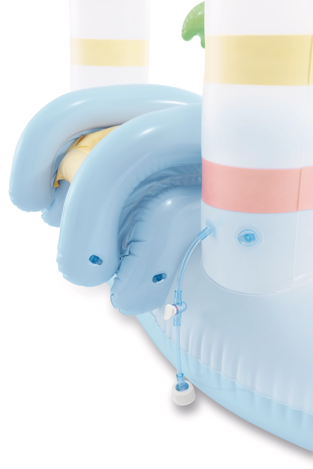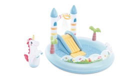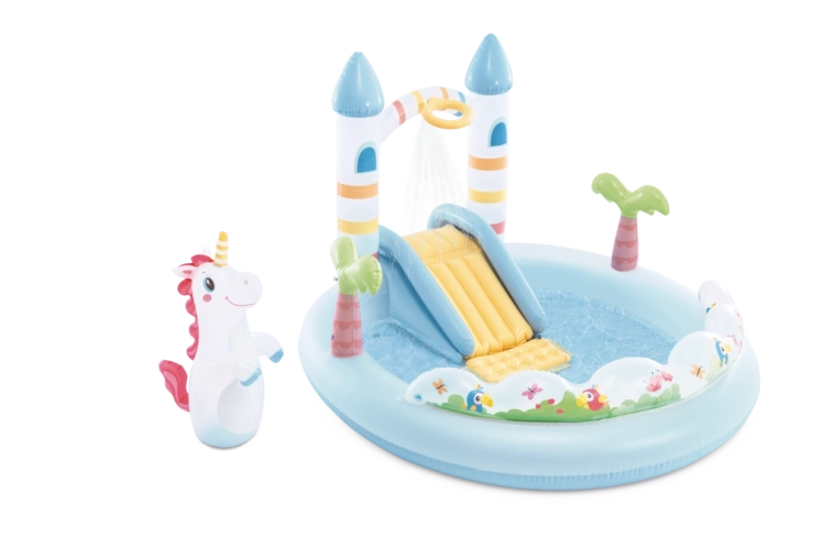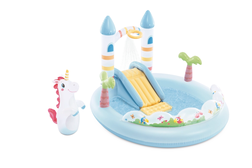 Tover je tuin om tot een sprookjesplek met het Eenhoornkasteel speelcentrum – een opblaasbare waterset voor kinderen vanaf 2 jaar. Biedt een ondiep badje, een zachte glijbaan met gepolsterde landingszone, een watersproeier na aansluiting op de tuinslang en leuke accessoires waaronder een opblaasbare eenhoorn en gekleurde ballen voor spel en motorische ontwikkeling.