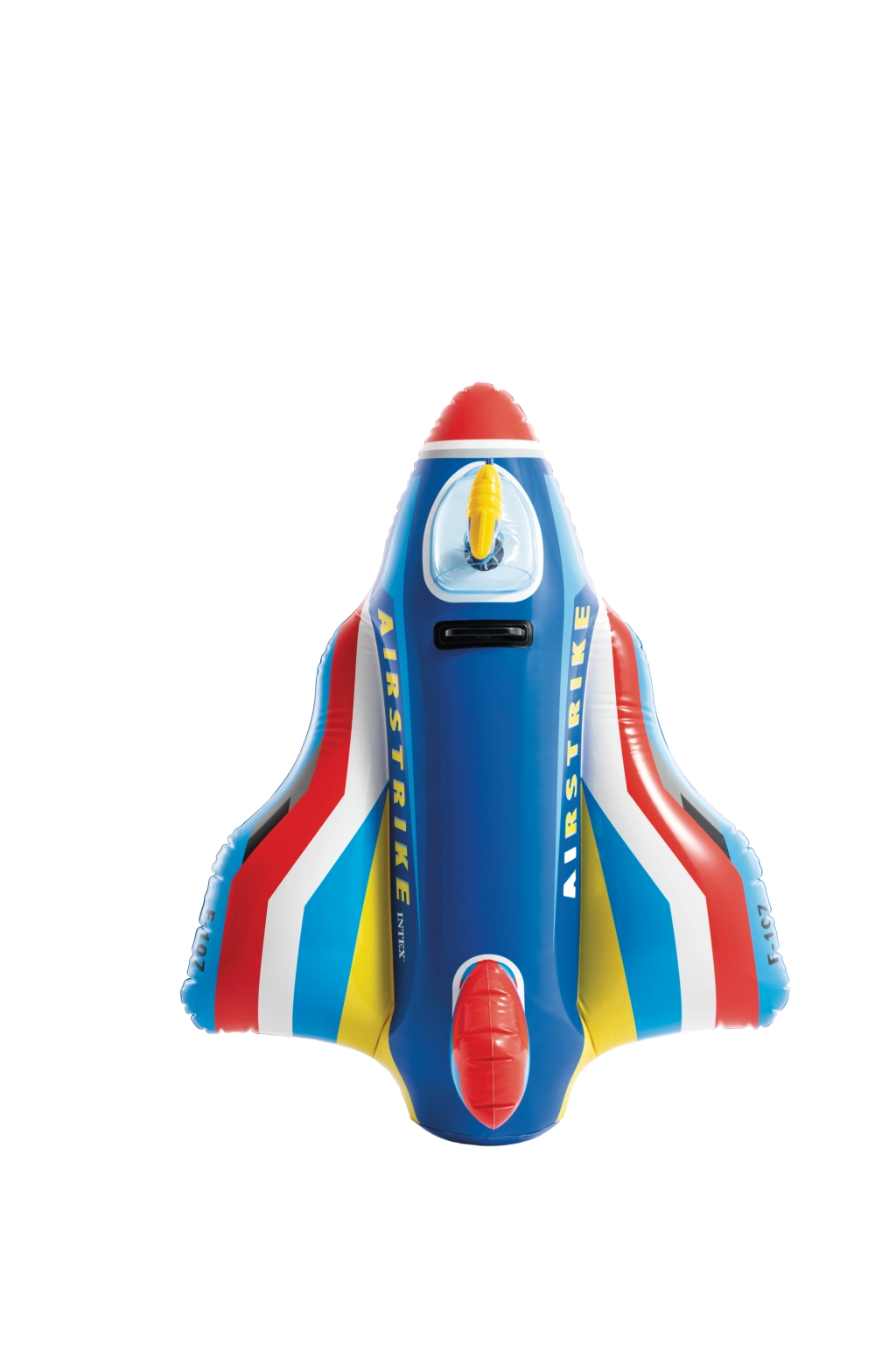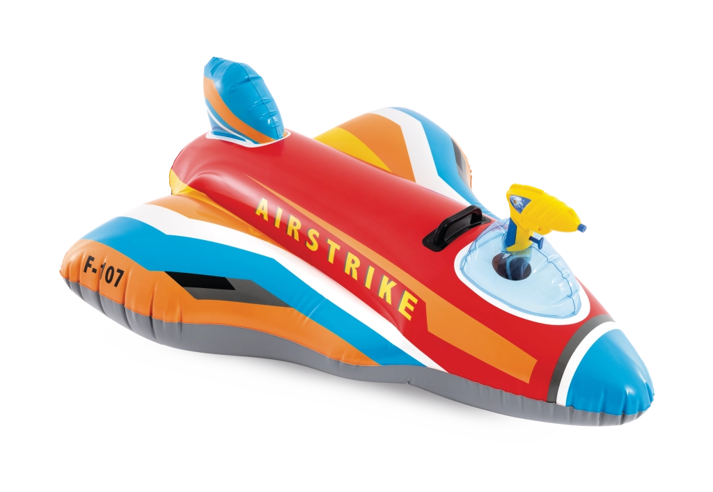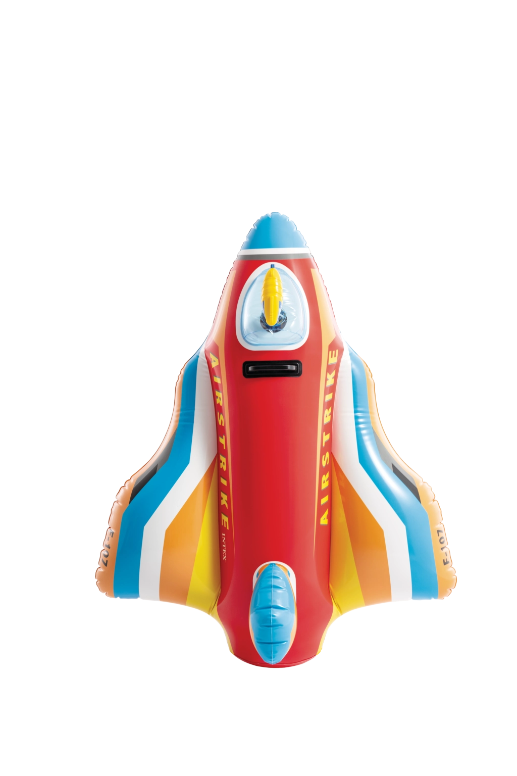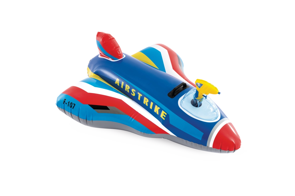 De duurzame constructie van hoogwaardig PVC en het stevige handvat zorgen voor veiliger spelen en betere controle tijdens het varen. De opvallende kleurencombinatie van rood, blauw, geel en wit en de opschriften AIRSTRIKE en F-107 geven het speelgoed een aantrekkelijke look die kinderen meteen aanspreekt.