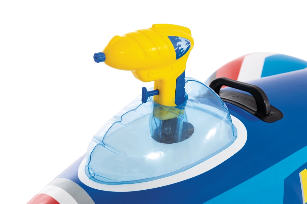 De opblaasbare straaljager AIRSTRIKE F-107 verandert elk zwembad in een actievolle luchthaven. Dankzij de brede vleugels en de achterste stabilisator is hij zeer stabiel en comfortabel voor jongere kinderen. Het geïntegreerde waterpistool in de cockpit maakt eenvoudig waterspuiten mogelijk en zorgt voor eindeloos plezier.