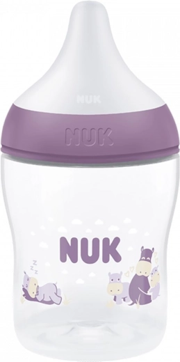 De NUK Perfect Match-fles is ontworpen om borstvoeding zo goed mogelijk na te bootsen. De speen met de voor NUK kenmerkende vorm volgt de tepel van de moeder, biedt een brede lipondersteuning en voldoende ruimte voor natuurlijke zuigbewegingen van tong en kaak. Dankzij het doordachte ontwerp komt de baby niet in contact met harde kunststof onderdelen.