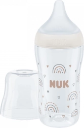 De geïntegreerde NUK temperatuurcontrole-indicator verandert van blauw (koud) naar wit (te heet) om te helpen voorkomen dat voeding te heet wordt gegeven. De ideale temperatuur is rond 37 °C, wanneer de indicator blauw is. De fles is gemaakt van duurzaam, hygiënisch glas, is BPA-vrij en voldoet aan de Europese norm EN 14350.