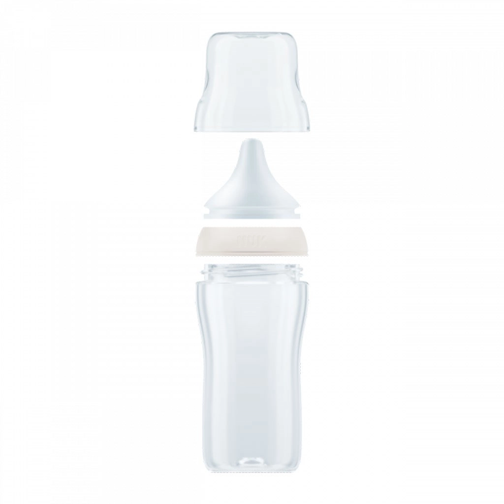 De glazen fles NUK Perfect Match bootst het natuurlijke gevoel van borstvoeding na – met een speciale orthodontische vorm gemodelleerd naar de tepel van de moeder, voldoende ruimte voor tong- en kaakbewegingen en een brede lipondersteuning die aan de huid van mama doet denken. Dankzij het verbeterde Anti Colic Air System is de melkstroom natuurlijk en rustig, zodat de baby ontspannen drinkt zonder onnodig lucht te slikken.