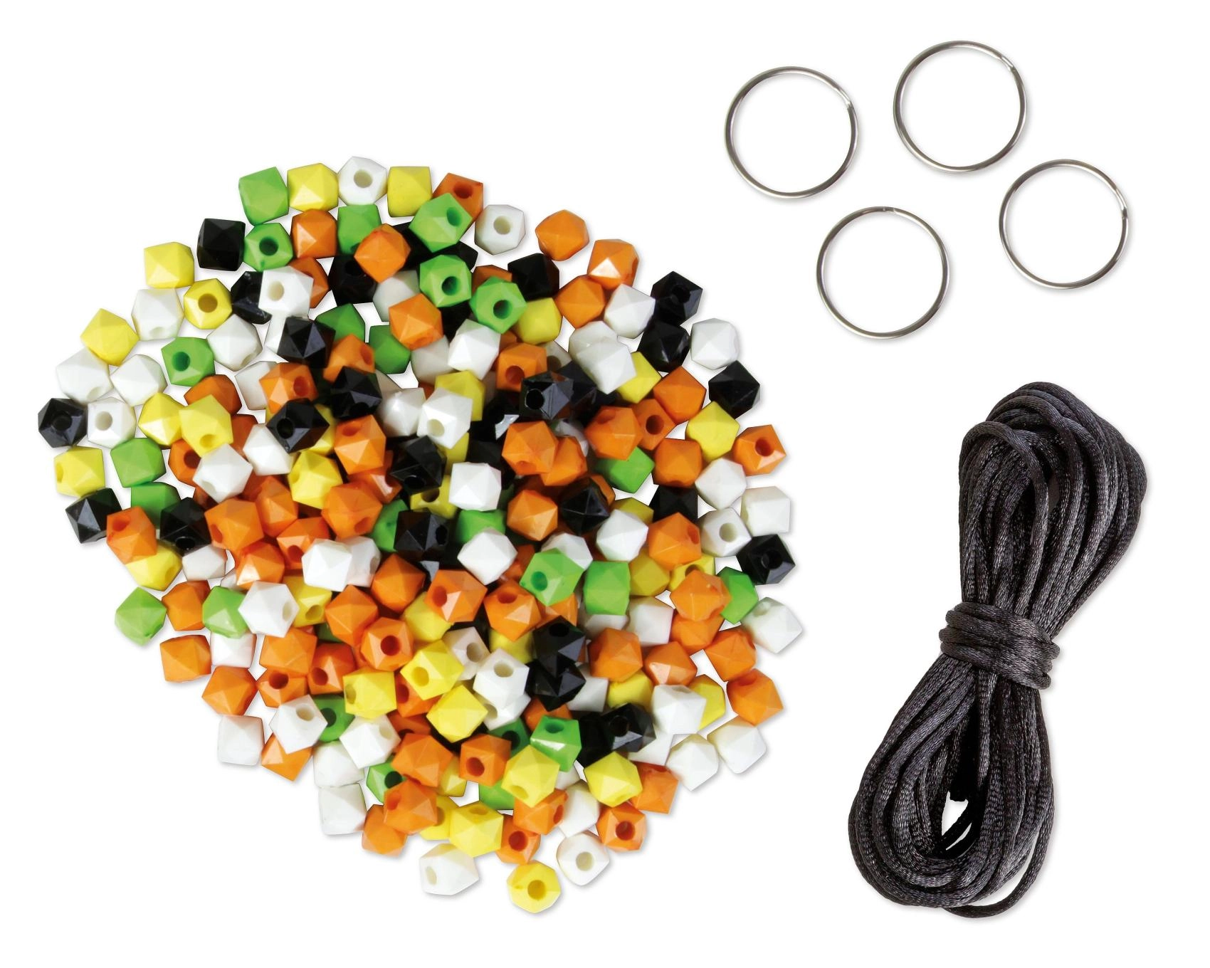 De set bevat 250 gekleurde kralen, een zwart koord en 4 metalen ringetjes – je hoeft niets bij te kopen, gewoon beginnen.