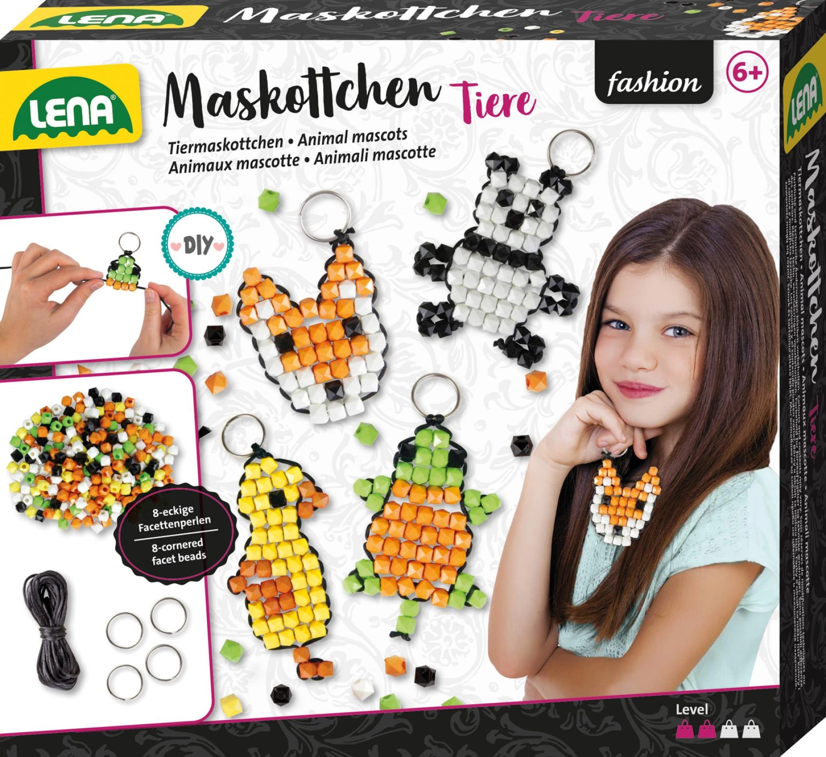 In de verpakking vind je 250 modieuze kralen in vrolijke kleuren, een zwarte koord om te rijgen en 4 metalen ringetjes voor het afwerken van de hangers. De werkwijze is eenvoudig en intuïtief – volg het patroon en je maakt in een mum van tijd stijlvolle talismannen.