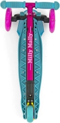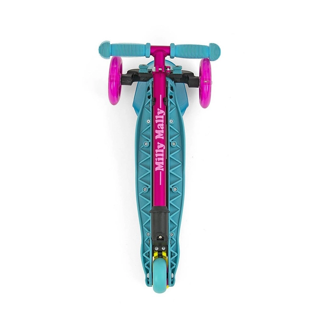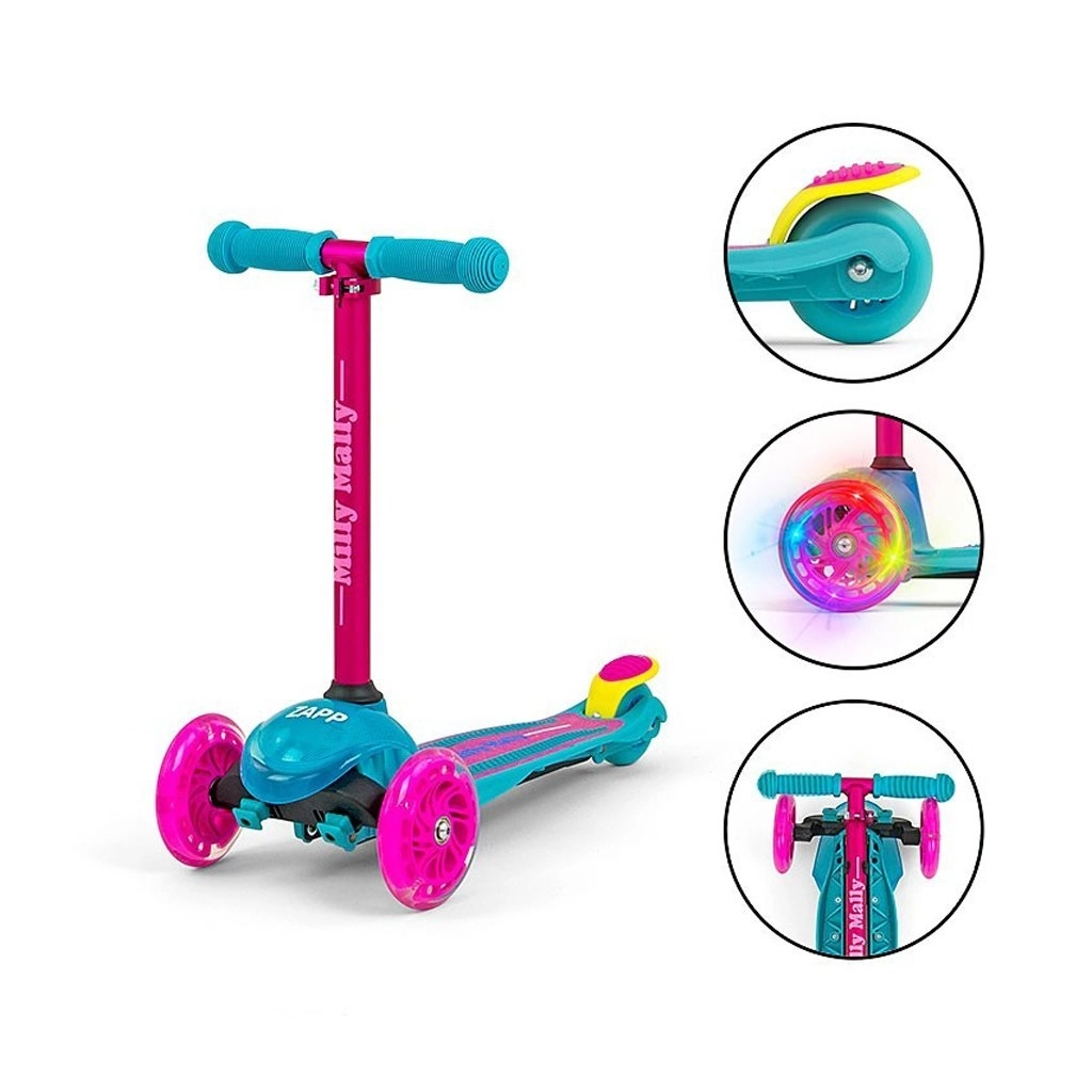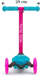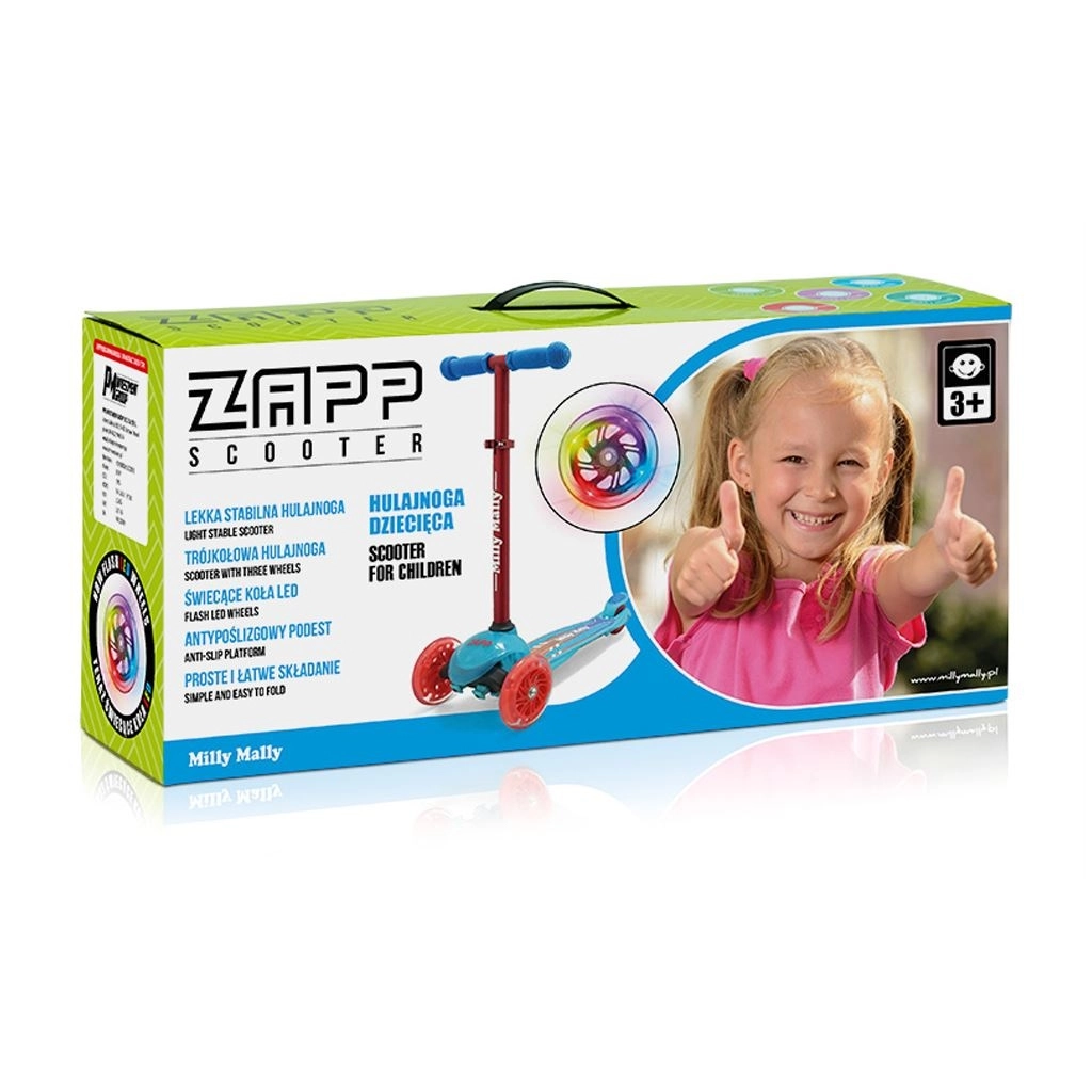 Lichte en stabiele kinderstep MILLY MALLY Zapp met drie wielen en in hoogte verstelbaar stuur (61/66 cm) is ideaal voor kinderen vanaf 3 jaar. Biedt eenvoudige besturing door lichaamshelling, voorwielen met verlichting voor extra plezier en een achterrem met spatbord voor veilig rijden. Het maximale draagvermogen is 50 kg.