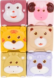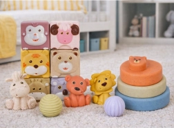 Bevat vierkante blokjes met dierenmotieven, ronde onderdelen voor het bouwen van een toren, knijpfiguurtjes en sensorische balletjes. Het speelgoed is geschikt voor droog spel en in bad, droogt snel en is eenvoudig te reinigen – ideaal voor dagelijks gebruik, thuis en onderweg.