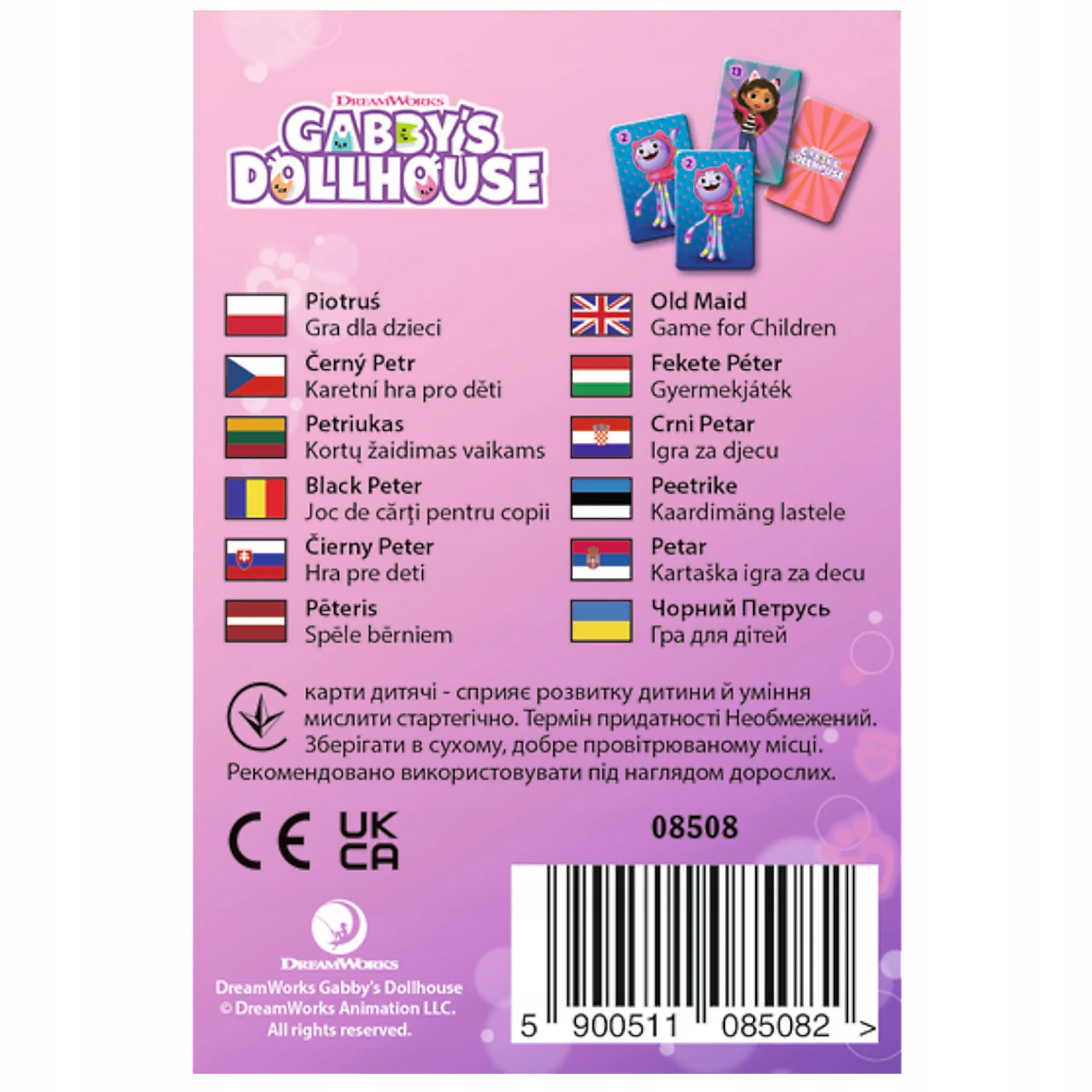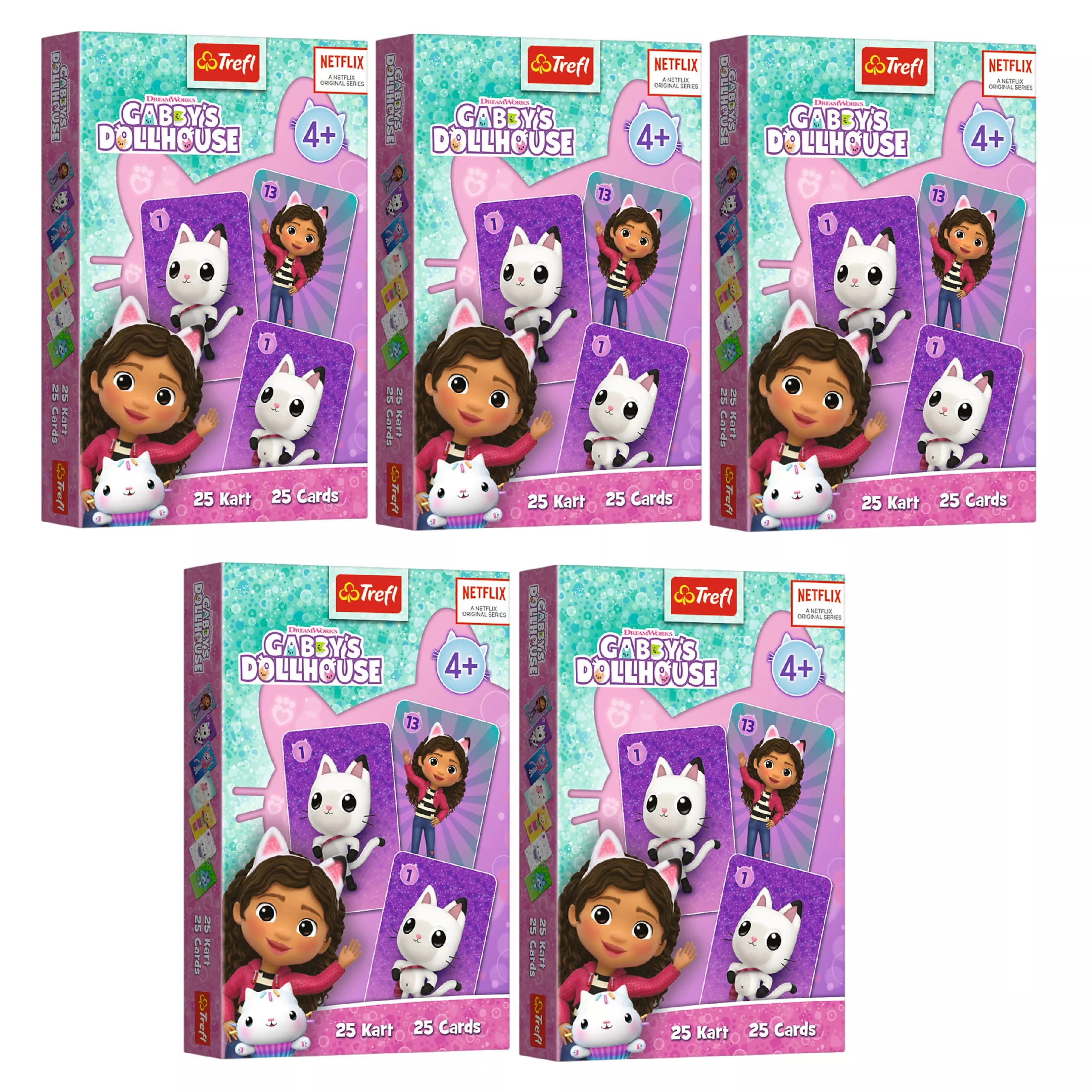 Het legendarische familiespel Zwarte Piet in de GABBY'S DOLLHOUSE-editie biedt eenvoudige regels en veel plezier. Het doel is om paren met dezelfde afbeeldingen te vormen en aan het eind niet met de kaart van Zwarte Piet te blijven zitten. De set bevat 5 complete pakjes – ideaal voor meerdere kinderen, voor feestjes en voor op de opvang of kleuterschool.