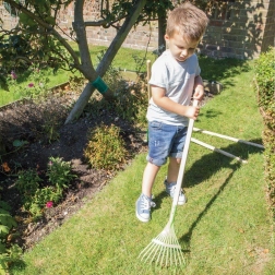 De ergonomische houten steel en uitgebalanceerde constructie zorgen ervoor dat kinderen comfortabel en veilig kunnen werken bij het harken van bladeren en gras.