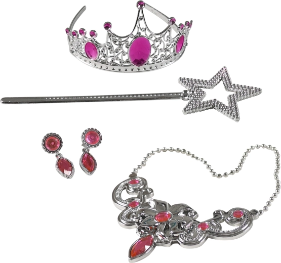 Verander je in een betoverende prinses in een oogwenk! Deze set bevat alles voor magische verkleedmomenten: een zilveren kroon, een toverstok, een elegante ketting en glinsterende oorbellen. Roze steentjes geven de hele set een sprookjesachtige uitstraling – ideaal voor een carnaval, verjaardagsfeest of prinsessenspel thuis.