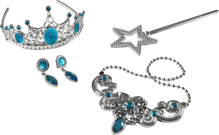 Deze betoverende blauwe set voor kleine prinsessen biedt alles wat je nodig hebt voor een sprookjesachtige transformatie. Glanzende details en blauwe steentjes geven de accessoires een subtiele sprankeling die op foto’s en tijdens het dagelijks spelen prachtig uitkomt.