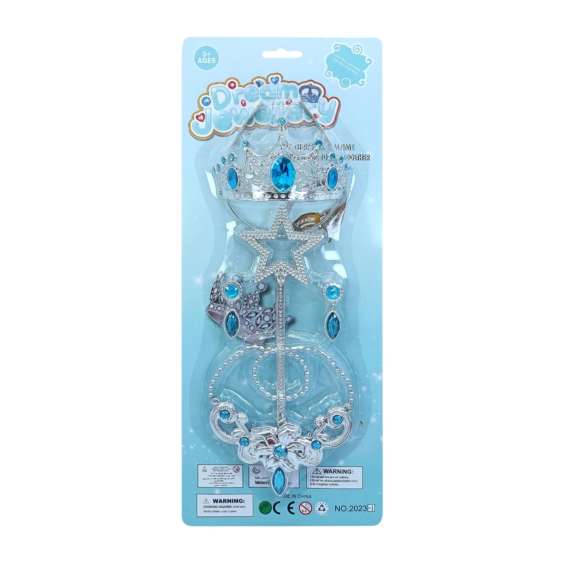 Verander je in een echte prinses in een oogwenk! Deze kinderset bevat een zilveren kroon, een toverstaf, een elegante ketting en glinsterende oorbellen met stralende blauwe steentjes. Ideaal voor carnaval, verjaardagsfeestjes en prinsessenspel thuis.
