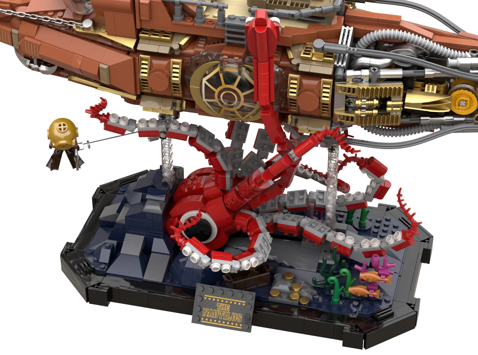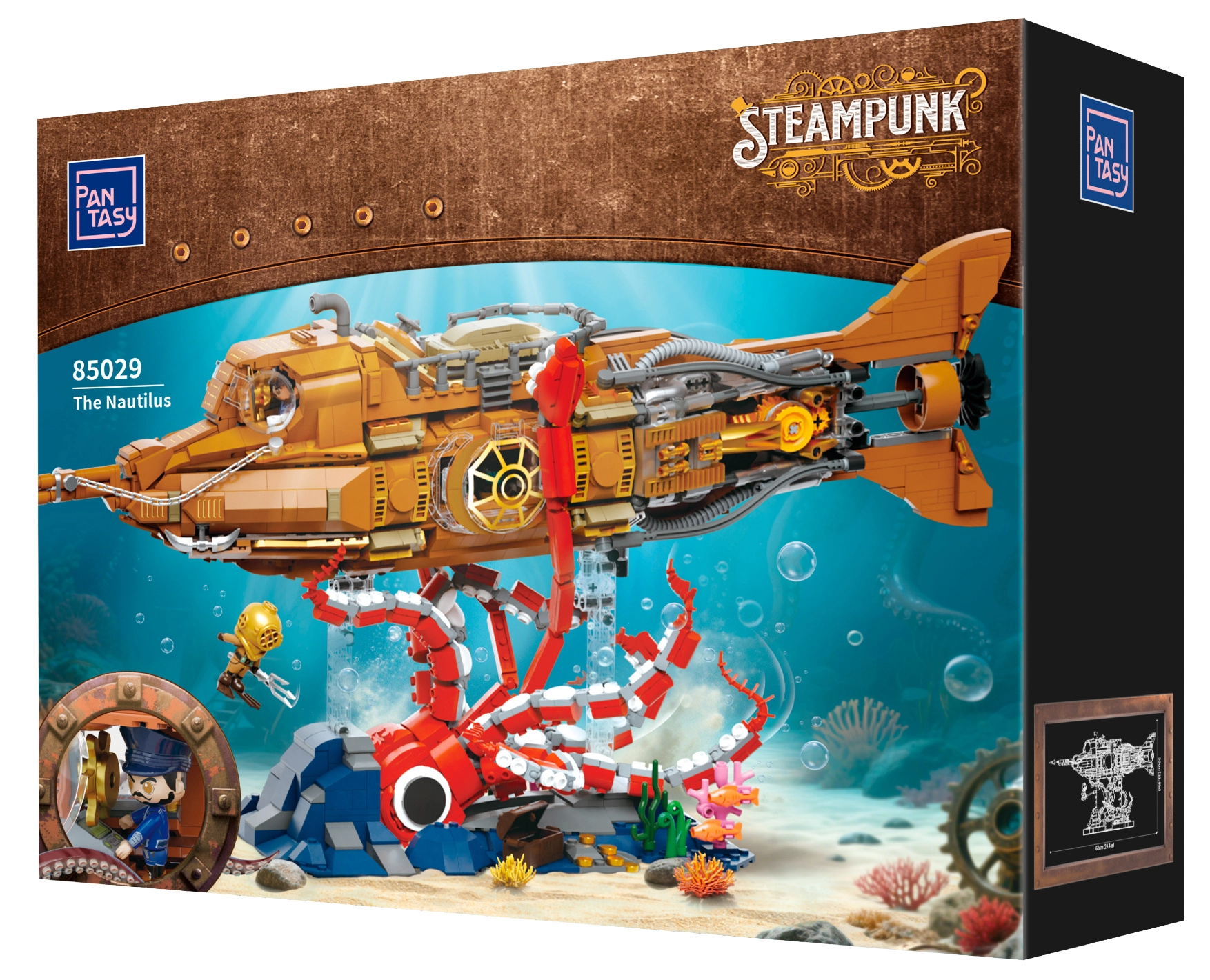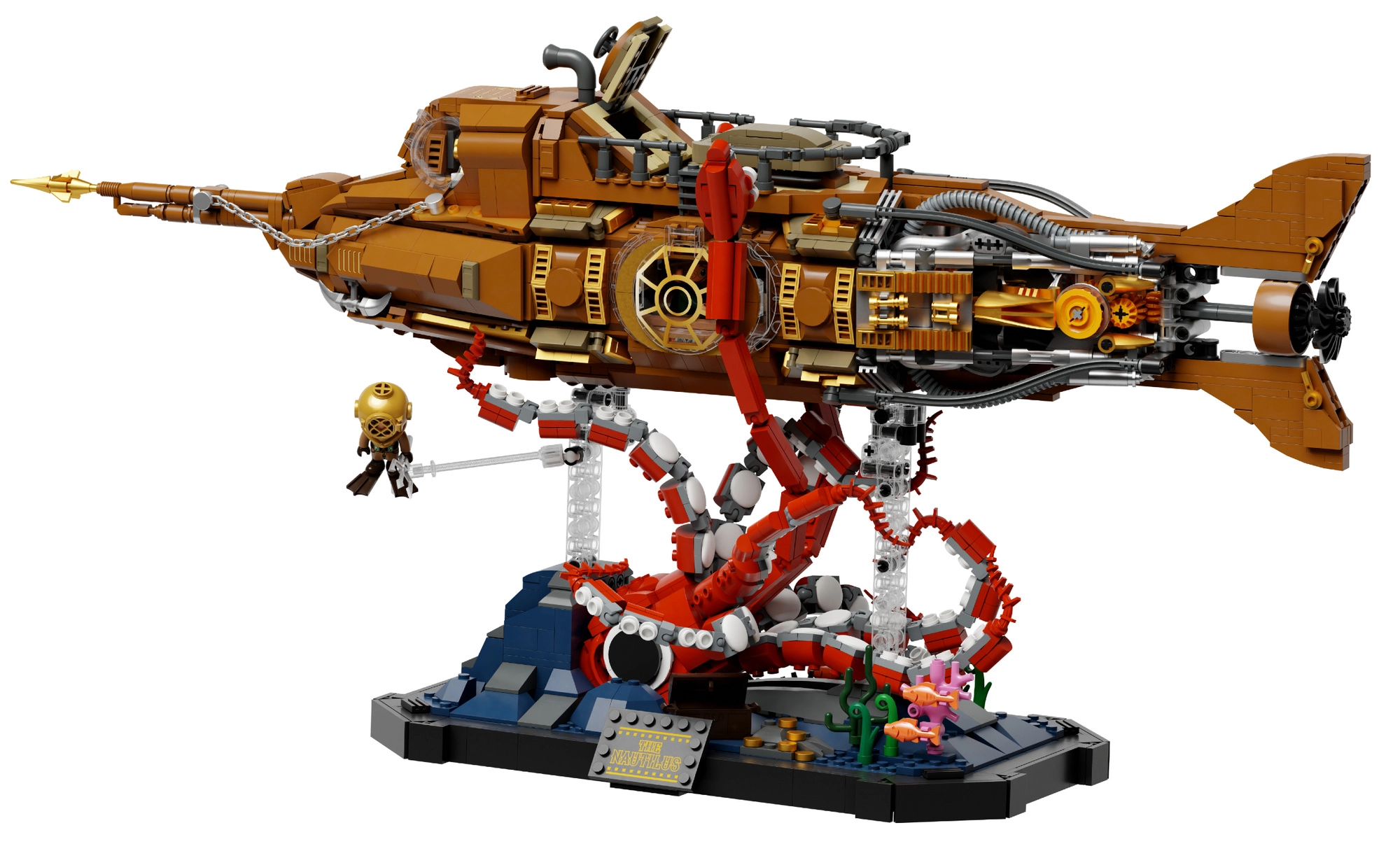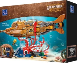 Dit verzamelmodel combineert precieze bouw met de uitgesproken esthetiek van steampunk. De driesectionele modulaire romp laat je in de cockpit, salon en machinekamer kijken, terwijl de draaiende scheepspropeller met tandwielen het model geloofwaardige mechaniek geeft. De scène op de voet met koralen en een aanvallende octopus zorgt voor een dynamisch onderwaterspektakel, ideaal om tentoon te stellen.