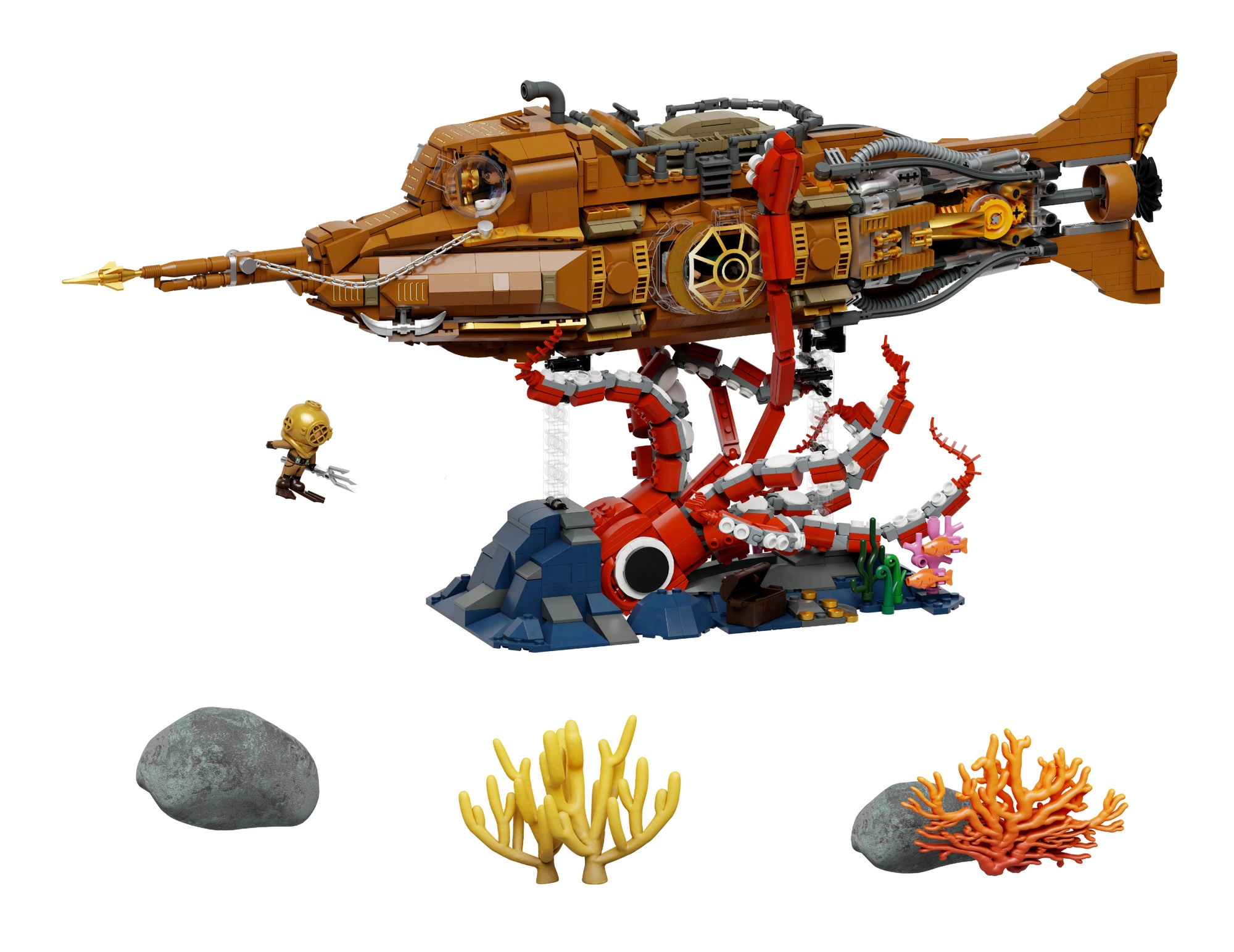 De bouwset bevat drie minifiguren – een kapitein, een professor en een duiker – om je eigen verhalen en avonturen te creëren. Dankzij de doordachte constructie ontwikkel je geduld, creativiteit en concentratie, en na voltooiing wordt het een opvallend stuk in elke collectie.