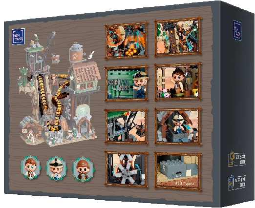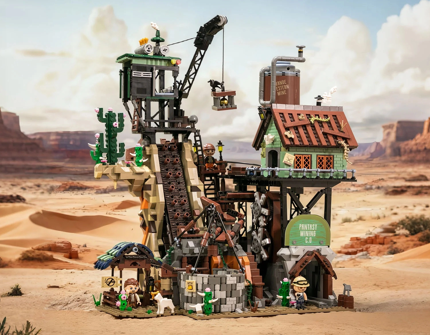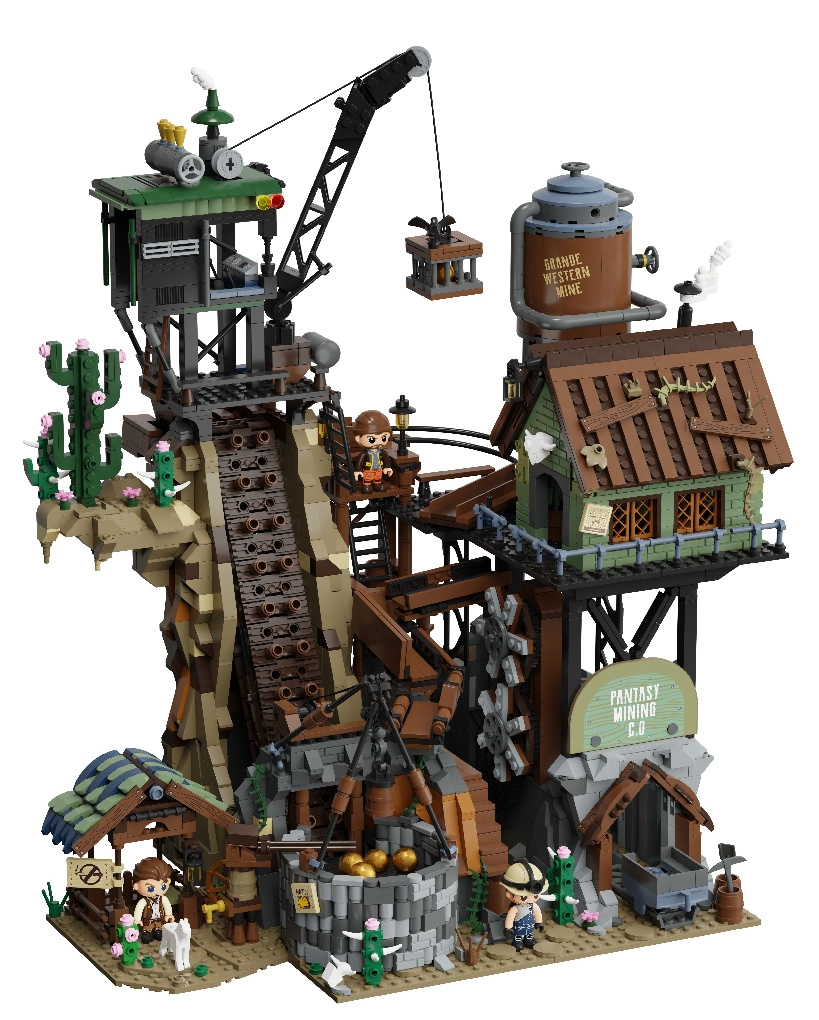 De Pantasy Western Mine bouwset neemt je mee naar de tijd van de goudkoorts. Houten constructies, machines, hellingen en de ingangstunnel vormen een indrukwekkend diorama dat na het bouwen ongeveer 40 × 32 × 46 cm meet. Dankzij het mechanische GBC‑systeem (Great Ball Contraption) bewegen de “gouden” balletjes voortdurend over de baan en keren ze terug naar het begin, wat voor een fascinerend schouwspel zorgt.