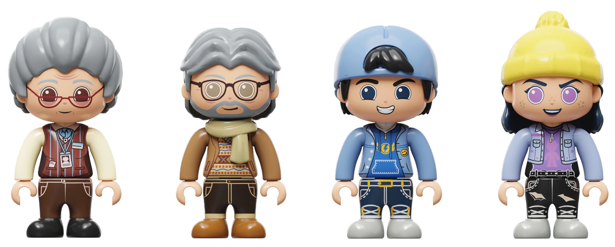 De set bevat vier figuren met opvallende outfits en accessoires, die scènes in de speelgoedwinkel dynamiek en karakter geven.