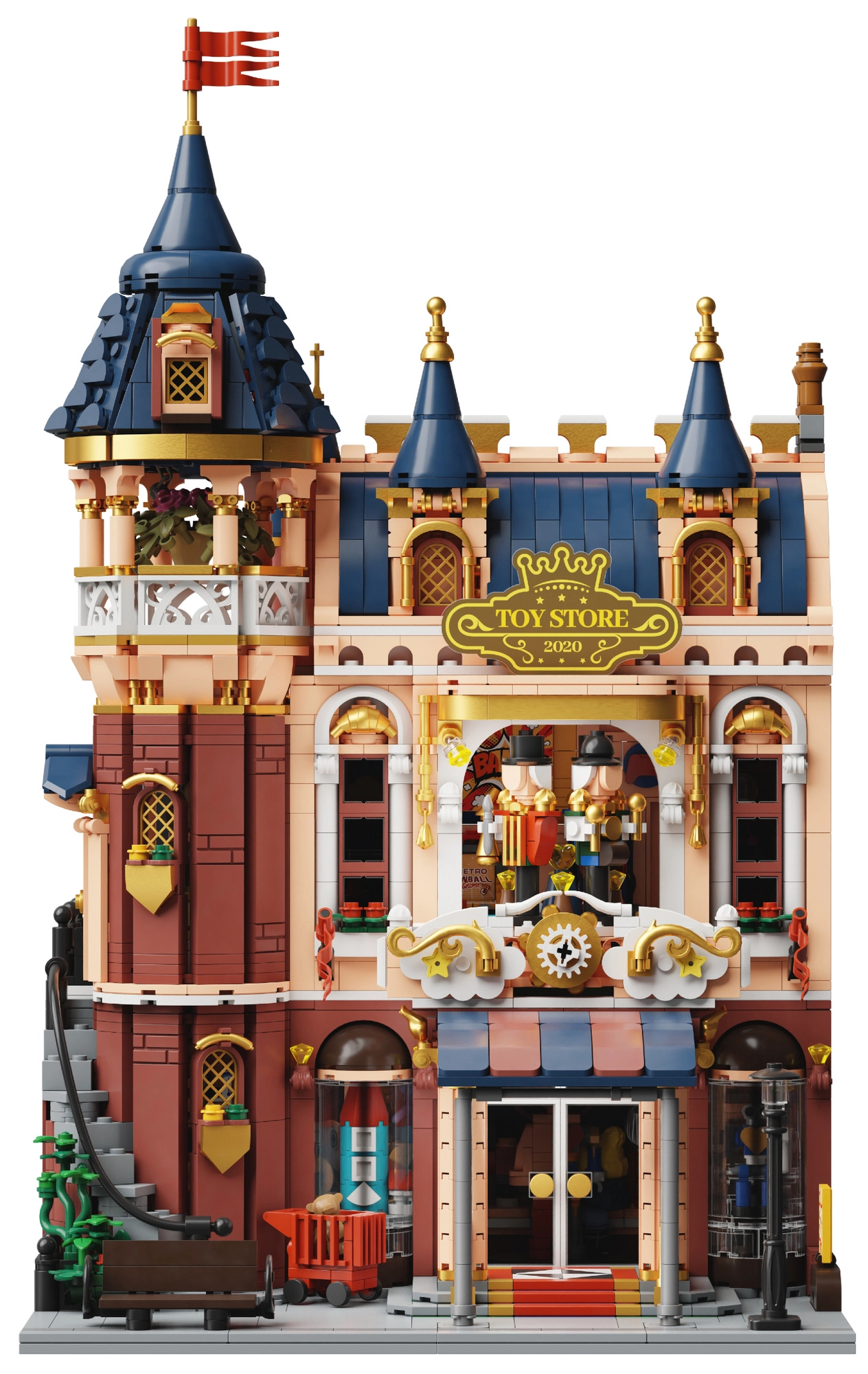Een sierlijke gevel, draaideuren, etalages en thematische hoekjes creëren een nostalgische sfeer van een klassieke speelgoedwinkel.