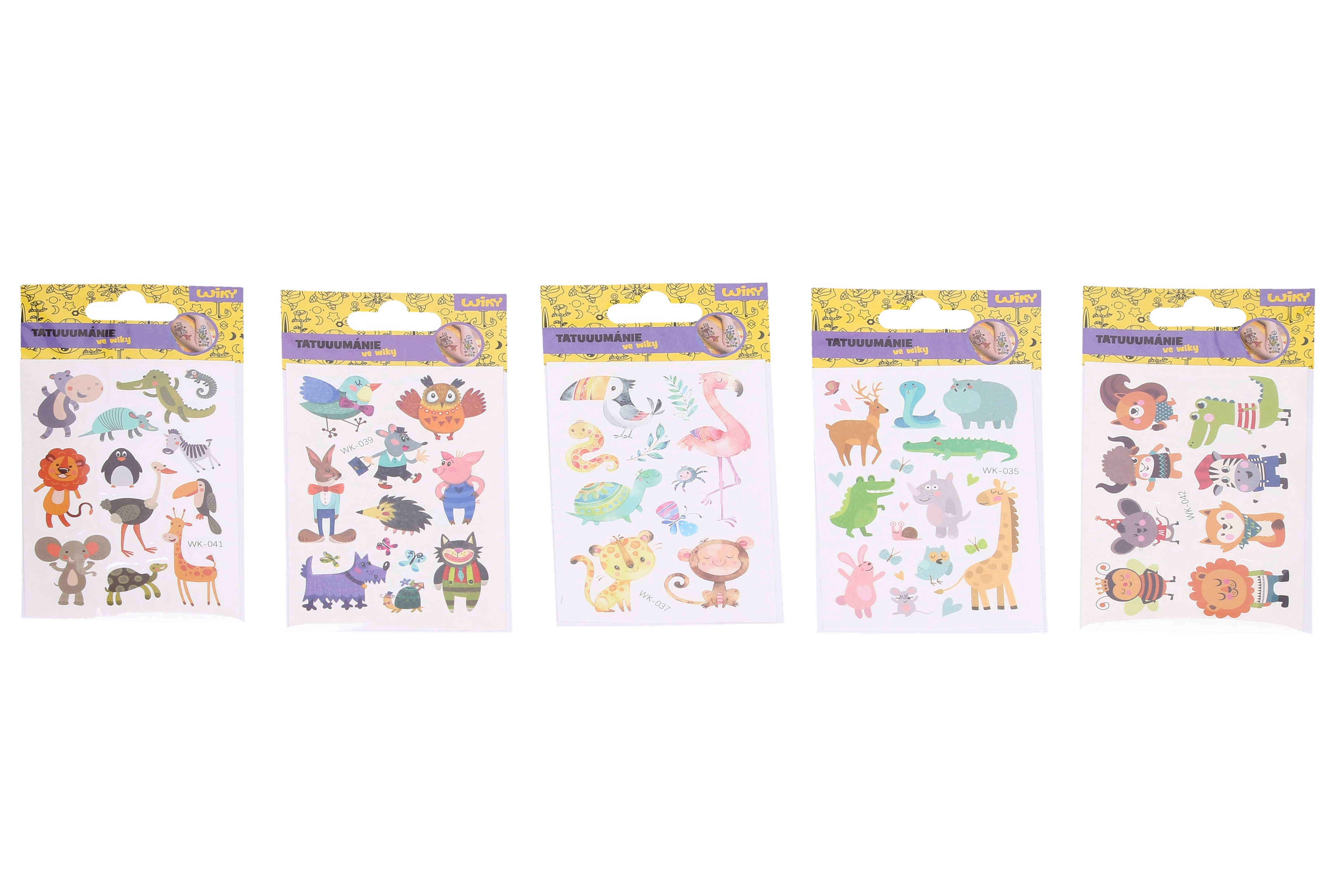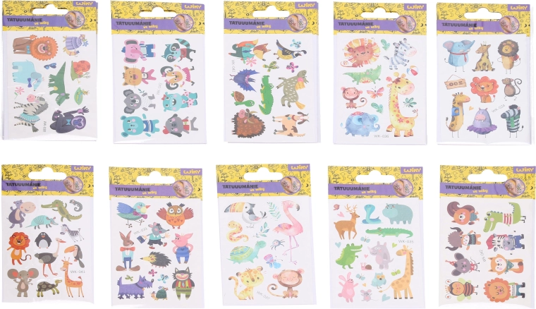 Breng leven in kinderfeestjes, kampen of familieweekenden met vrolijke tattoostickers met diertjes. Dankzij het praktische formaat van 7,5 × 11 cm zijn de motieven gemakkelijk op de huid over te brengen en blijven ze meerdere dagen zitten. De mix van schattige diermotieven zal kleine natuurliefhebbers verrukken.