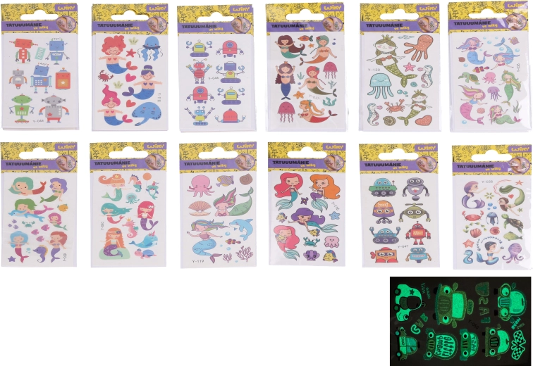 Tijdelijke tatoeages die opvallen! Deze tattoo-plakplaatjes bieden een kleurrijke mix van motieven en lichten op in het donker na blootstelling aan licht, ideaal voor feestjes, festivals en kostuums. Ze zijn huidvriendelijk en eenvoudig aan te brengen met water.