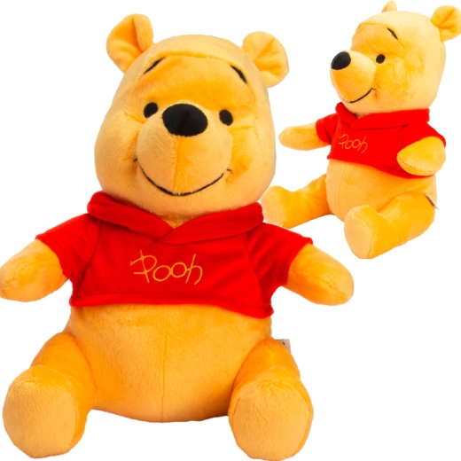 De knuffel kan zelfstandig zitten, waardoor hij er geweldig uitziet op de plank. Het rode shirt met het opschrift “Pooh” benadrukt de authentieke uitstraling van het personage.