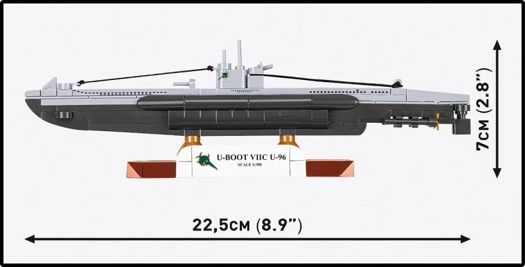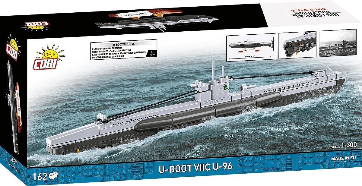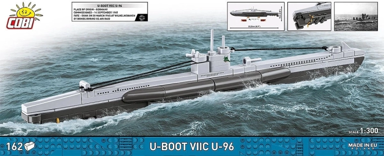 Bouw de legendarische onderzeeër U-BOOT VIIC U-96 op schaal 1:300 uit 162 stukjes. Een kwalitatieve Europese bouwset die verzamelaars, geschiedenisliefhebbers en fans van de film Das Boot zal bekoren. Met realistische rompdetaillering, toren met periscoop en een elegante standaard voor het uitstallen van het model.