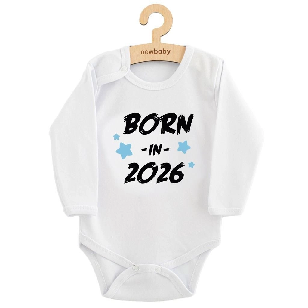 Stijlvolle babyromper met lange mouwen van het merk NEW BABY in een moderne blauwe kleur met de tekst “Born in 2026”. Gemaakt van 100% katoen met het certificaat OEKO-TEX STANDARD 100, zacht voor de gevoelige babyhuid. Praktische drukknoopsluiting op de schouder en tussen de beentjes maakt aan- en uitkleden en verschonen gemakkelijk.