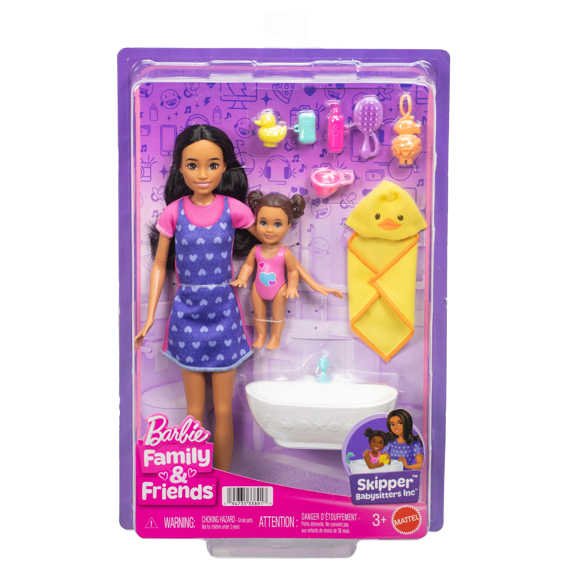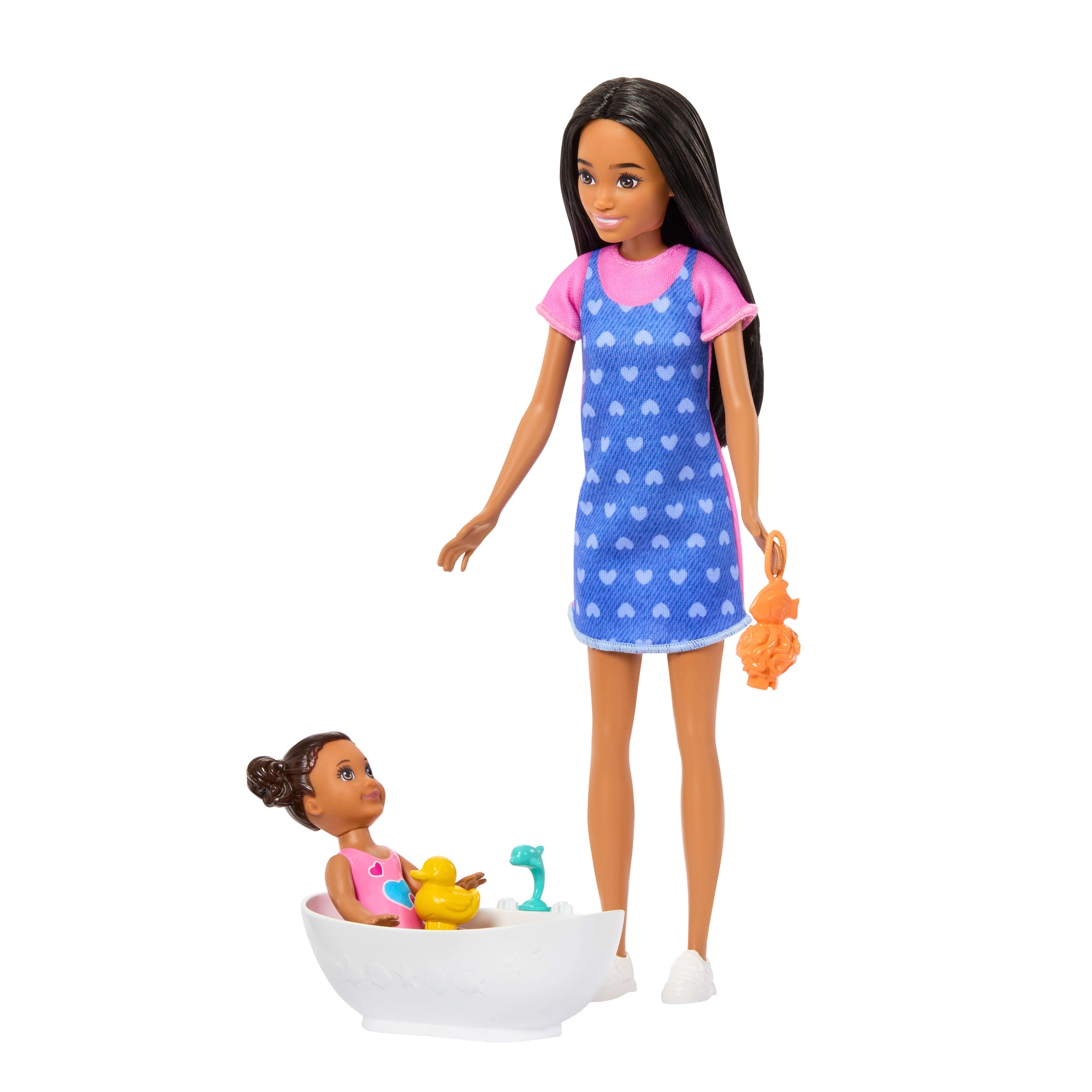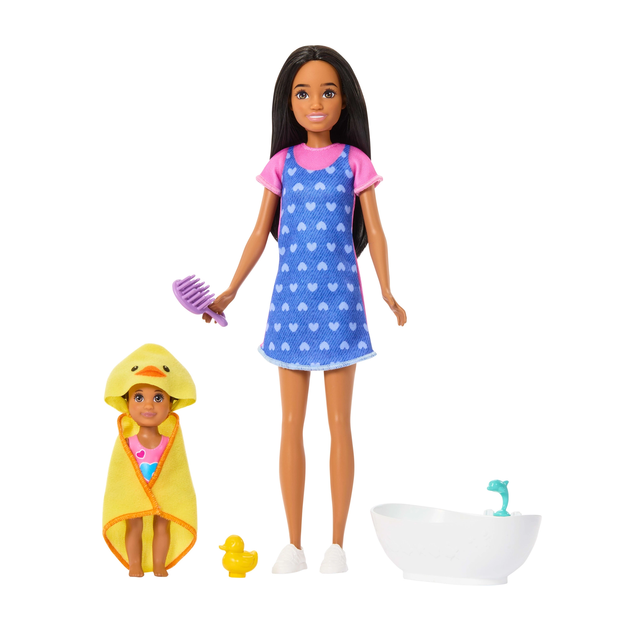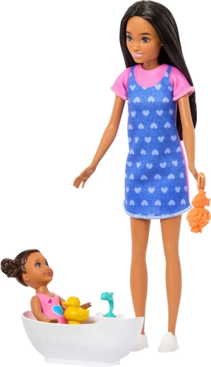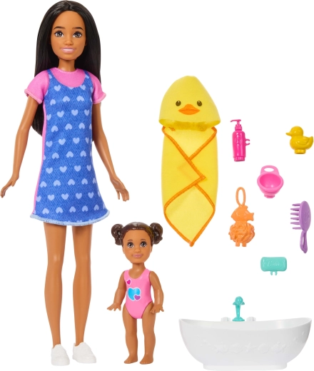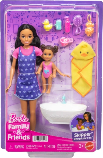 De set BARBIE Skipper Baby badtijd brengt authentiek speelplezier rond de verzorging van de kleinsten. De oudere zus Skipper draagt een jurk met blauwe schort met hartjes en comfortabele sneakers, terwijl de baby geniet van een bad in het badje met schattige accessoires. Kinderen kunnen keer op keer badroutines naspelen met het eendje, de badcape met capuchon en “cosmetica”.