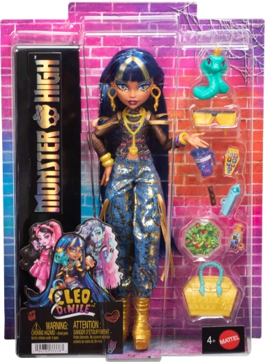 Betreed de wereld van MONSTER HIGH met de iconische Cleo De Nile, die straalt in een moderne Egyptische stijl. De korte haltertop, netmouwen en blauwe cargobroek met gouden accenten onderstrepen haar koninklijke afkomst. In de verpakking zit ook de trouwe cobra Sykfia, die elke griezelig-stijlvolle scène compleet maakt.