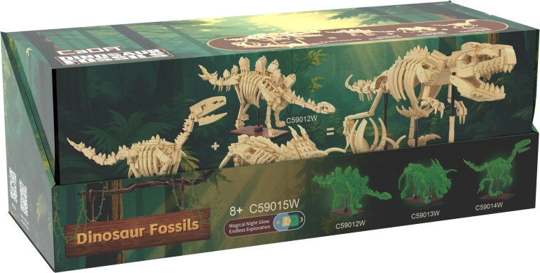 De CaDA Dinosaur Fossils bouwset vermaakt jonge en oude fans van prehistorie en educatieve modellen. Met kwaliteitsonderdelen maak je drie indrukwekkende skeletexposities met scharnierend beweeglijke ledematen, staart en kaak, die je in verschillende poses kunt plaatsen. Het speciale materiaal van de botten licht op in het donker, waardoor de modellen ook na zonsondergang unieke decoraties zijn.