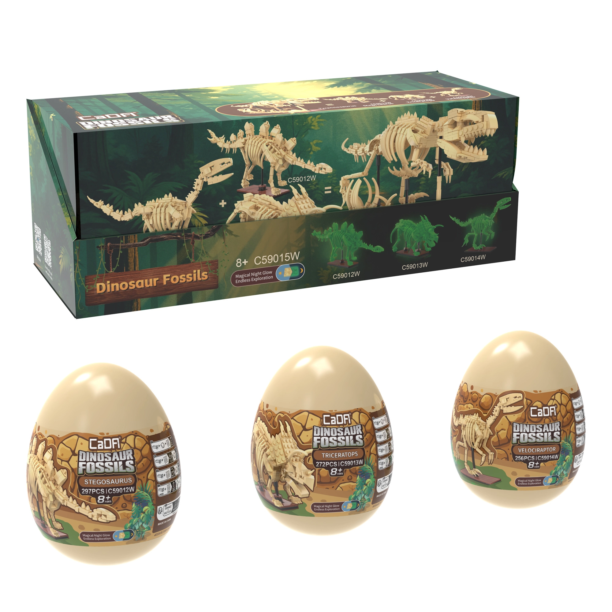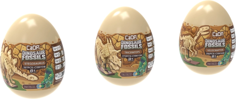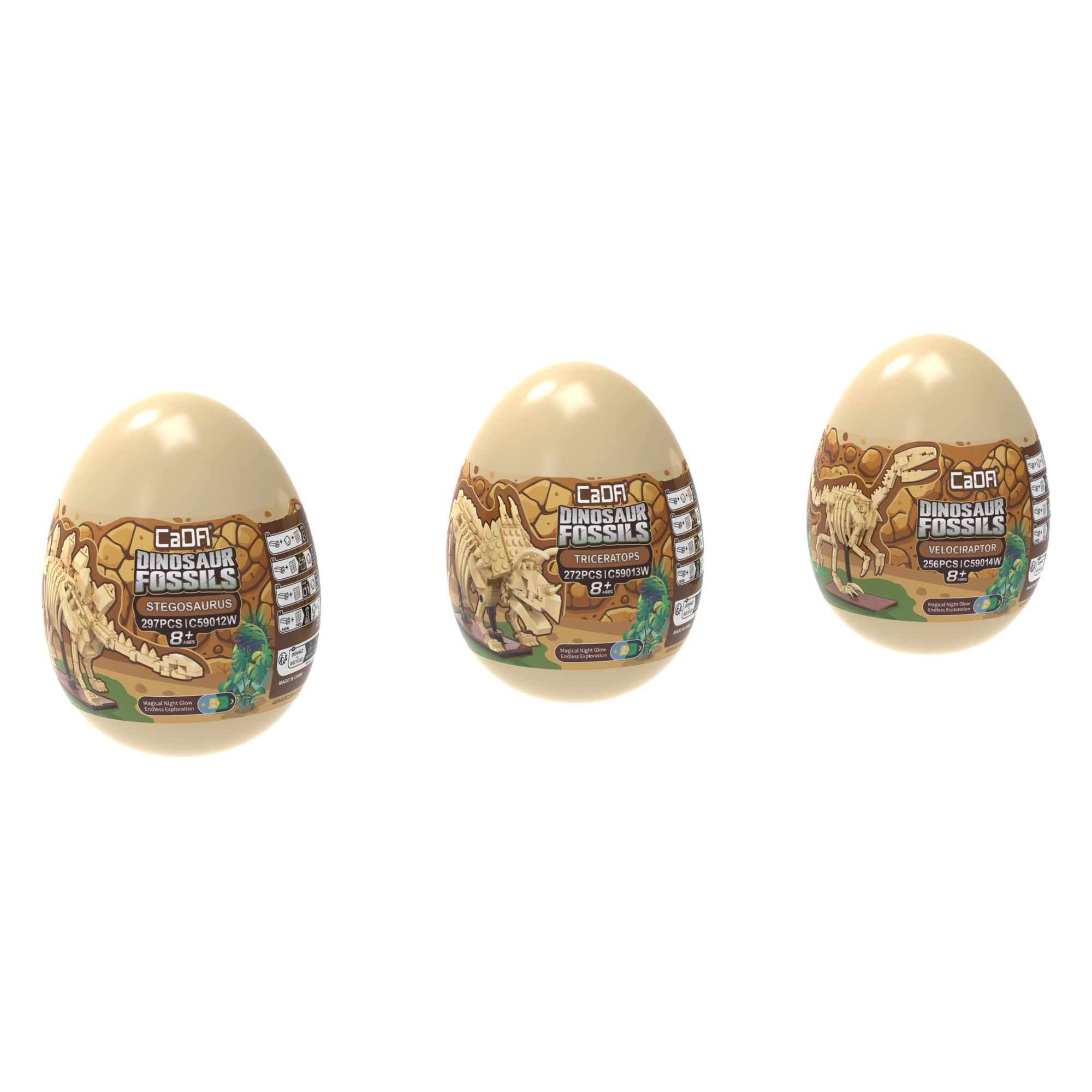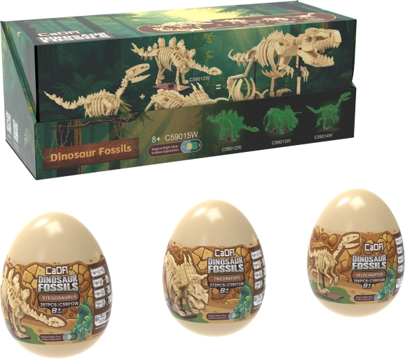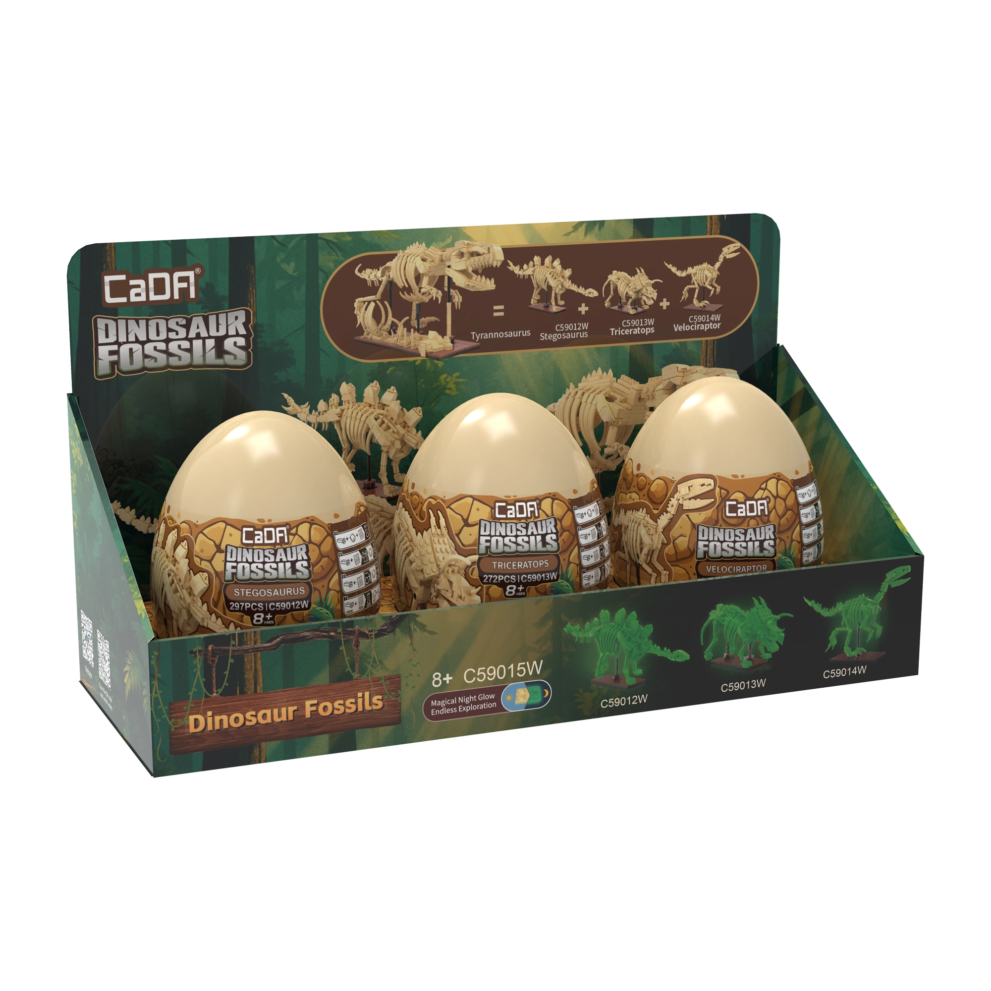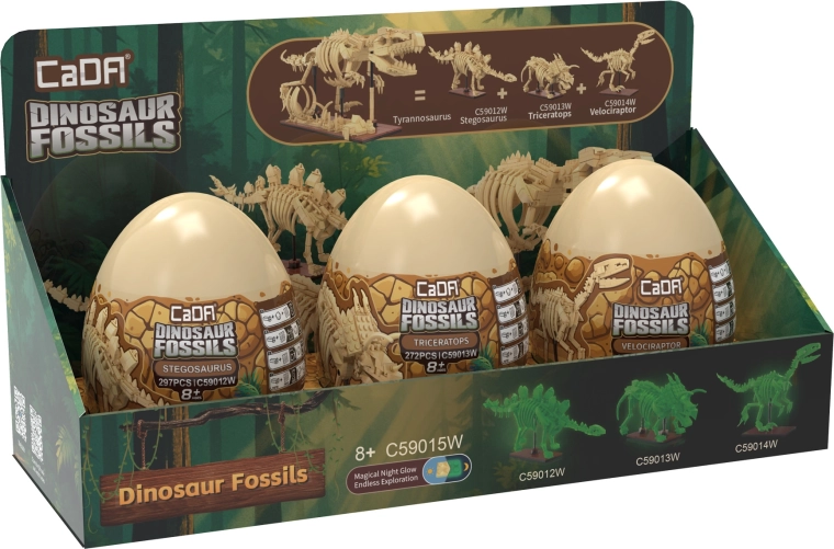 Ontdek de fascinerende wereld van dinosaurussen met de CaDA Dinosaur Fossils bouwset. Bouw drie gedetailleerde skeletmodellen – Triceratops, Stegosaurus en Velociraptor – en combineer ze vervolgens tot een imposante TYRANNOSAURUS REX. De onderdelen hebben een lichtgevend effect in het donker, de gewrichten zijn beweeglijk en de set bevat in totaal 825 compatibele onderdelen in praktische verzamel-eieren.