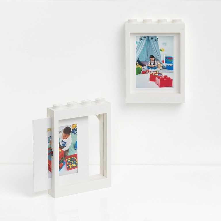 De elegante witte LEGO-fotolijst is een ideale keuze voor iedereen die favoriete foto’s graag in het zicht heeft. Dankzij het slimme ontwerp kun je hem aan de muur hangen of vrij neerzetten op een nachtkastje, dressoir of plank. De kartonnen inzet is geschikt voor twee populaire fotoformaten, zodat je eenvoudig afbeeldingen van 10×15 cm en 12×17 cm plaatst.