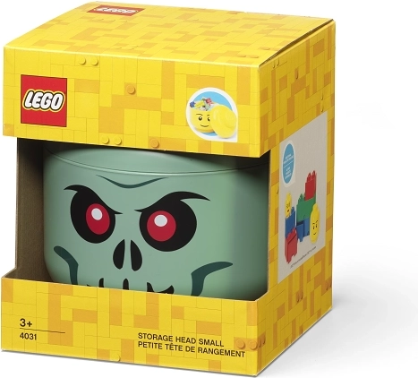 Stijlvolle opbergcontainer in de vorm van een LEGO minifiguurhoofd voor overzichtelijke opslag van kleine spullen. Afneembare deksel, duurzame kunststof zonder BPA, ftalaten en PVC en een speels skeletontwerp maken opruimen leuk.