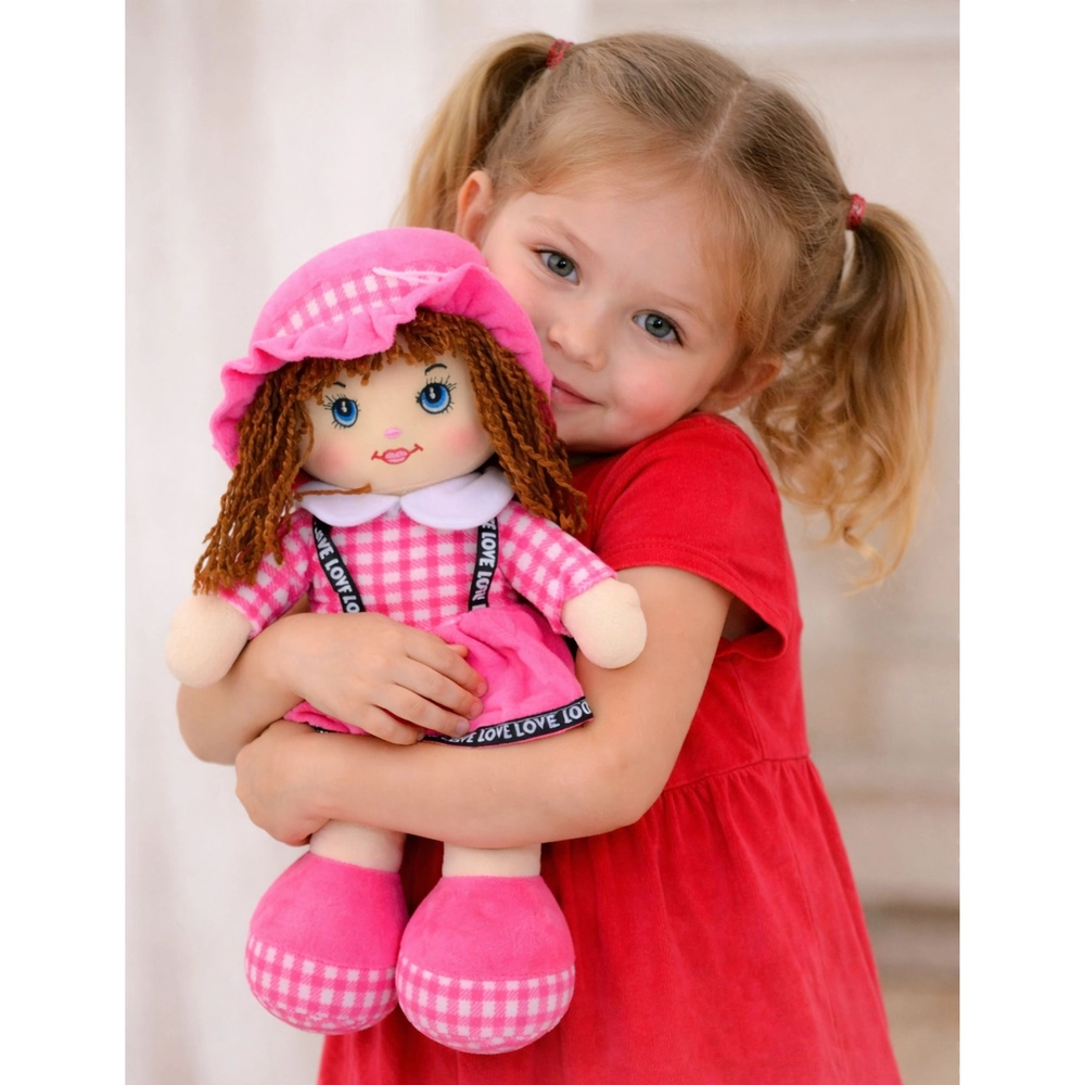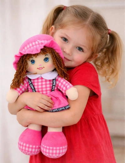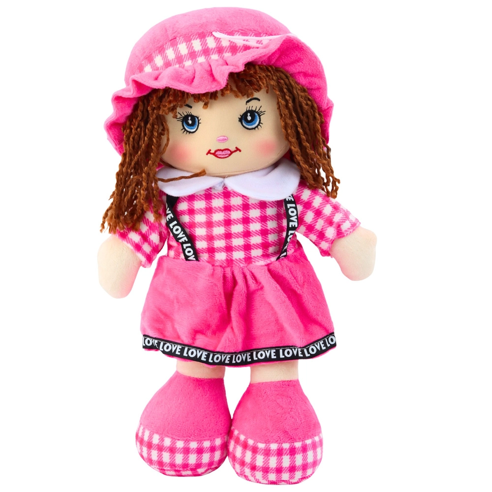 Een schattige roze stoffen pop van 35 cm hoog is de ideale metgezel voor dagelijks spelen en knuffelen. Gemaakt van zachte en veilige materialen, met een zachte vulling en geborduurde gezichtdetails zonder kleine onderdelen. De stijl wordt compleet met een roze geruite rok, hoedje en zachte schoentjes – perfect voor fantasiespel en het oefenen van zorgvaardigheden.