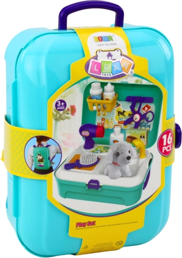 Draagbare set voor de verzorging van huisdieren PET CARE in de vorm van een koffer met rugzakfunctie verandert elke plek in een kleine salon. Kinderen genieten van een rijke uitrusting van 16 delen, inclusief föhn, borstel, schaar en een schattige pluchen hond. De compacte en duurzame set stimuleert creatief rollenspel en ontwikkelt empathie en fijne motoriek.