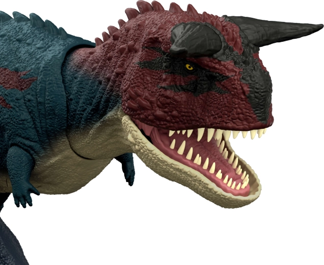 Getextureerde huid, hoorns en filmkleuren geïnspireerd door Jurassic World maken van de Carnotaurus een opvallende figuur voor spel en display.
