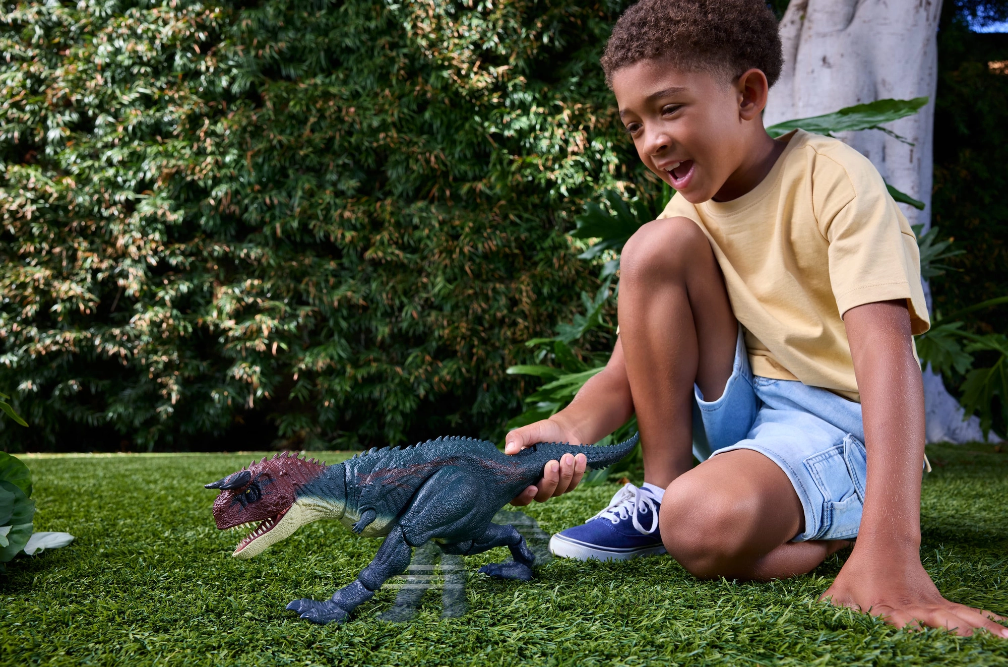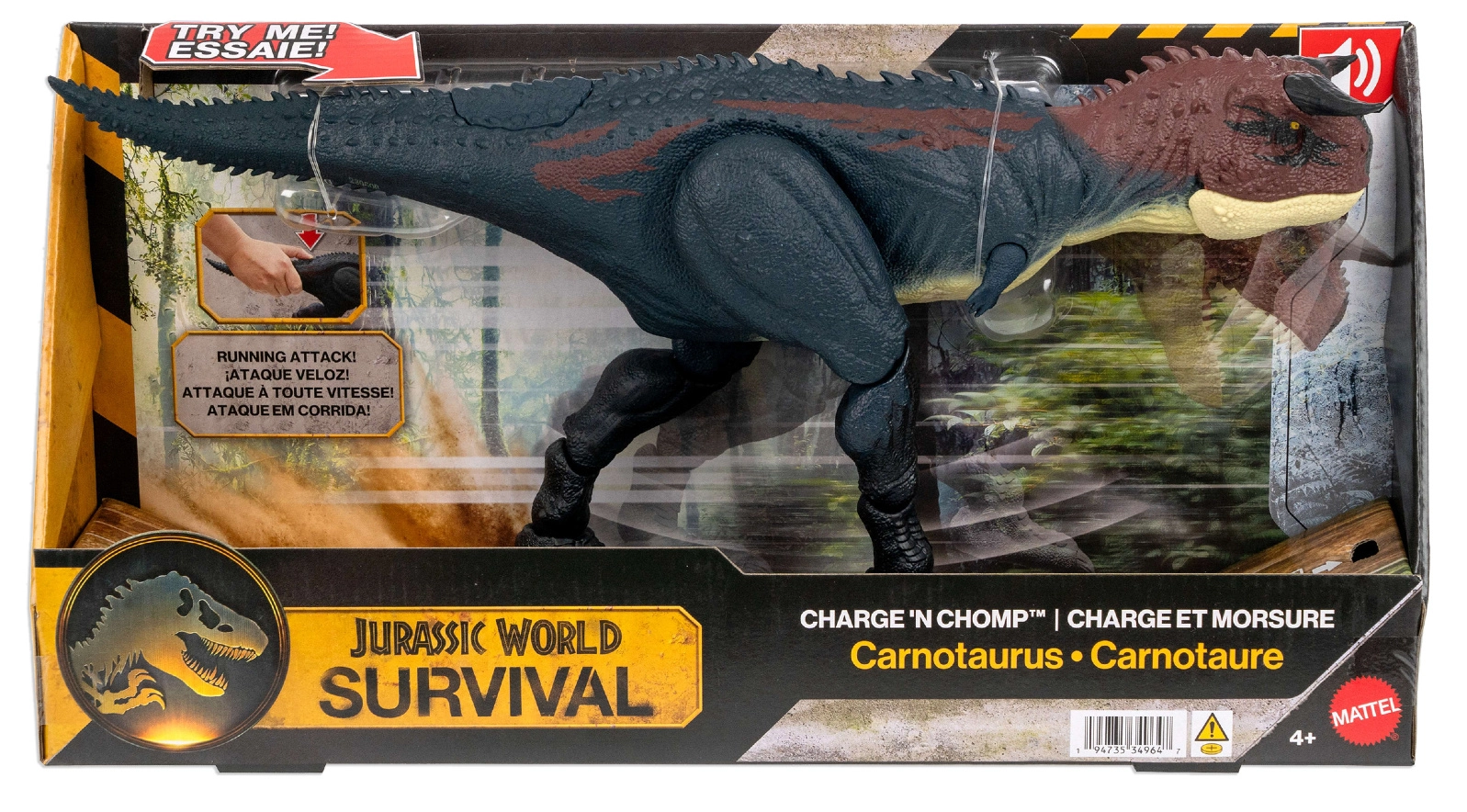 Ontdek dynamisch dinosaurusspel met de Jurassic World Carnotaurus figuur van circa 20 cm hoog. Biedt interactieve beweging, brullende geluiden, openende kaken en een gedetailleerde filmische look. Bij het indrukken van de knop bij de staart start een realistische renactie met bewegende poten en een “bijt”-actie, die de verbeelding prikkelt en dynamische verhalen stimuleert.