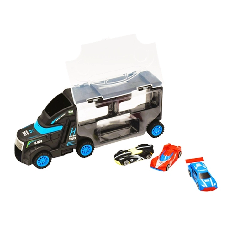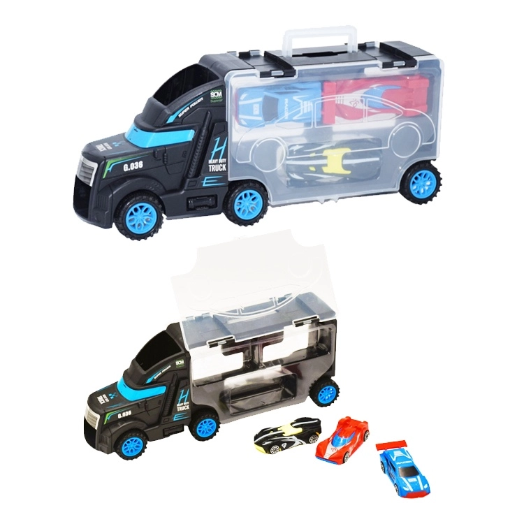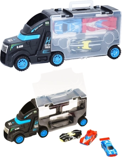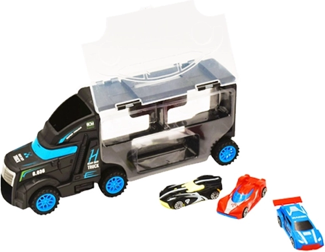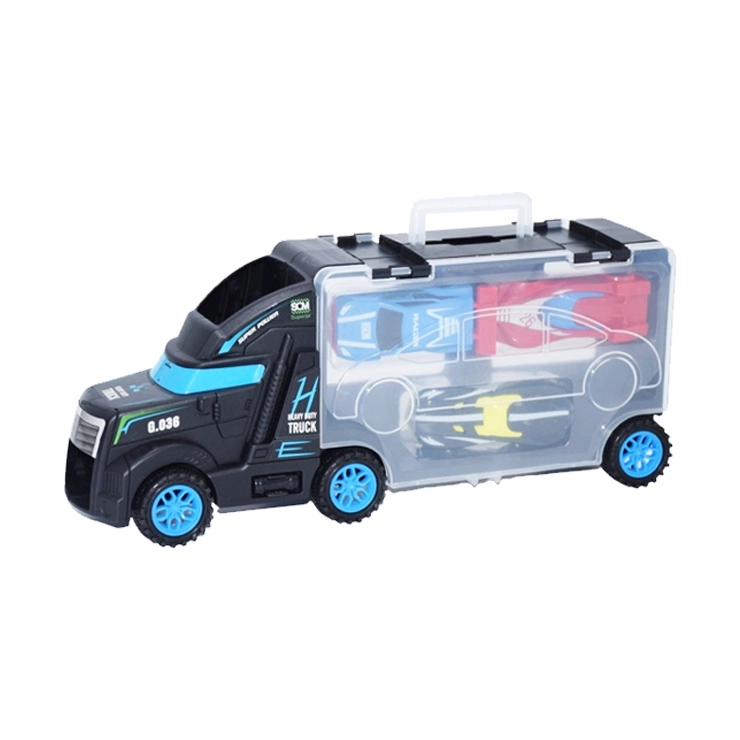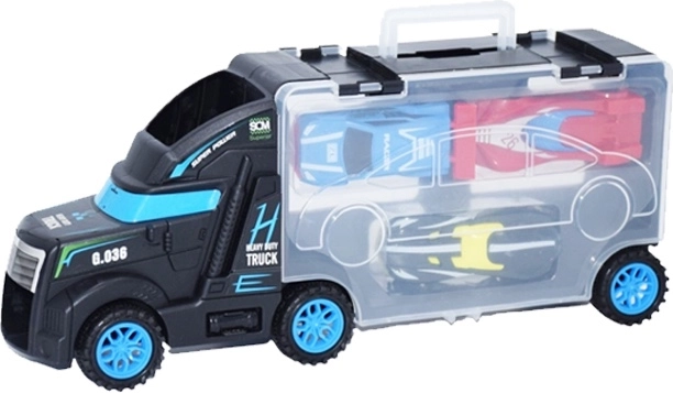 Deze multifunctionele vrachtwagen dient als transporter én koffertje voor kleine raceautootjes. Kinderen kunnen een autootje op de cabine plaatsen en het laten rijden, en daarna alles eenvoudig opbergen in de transparante ruimte met sluiting. De compacte afmetingen en het praktische handvat maken meegenomen op reis gemakkelijk.